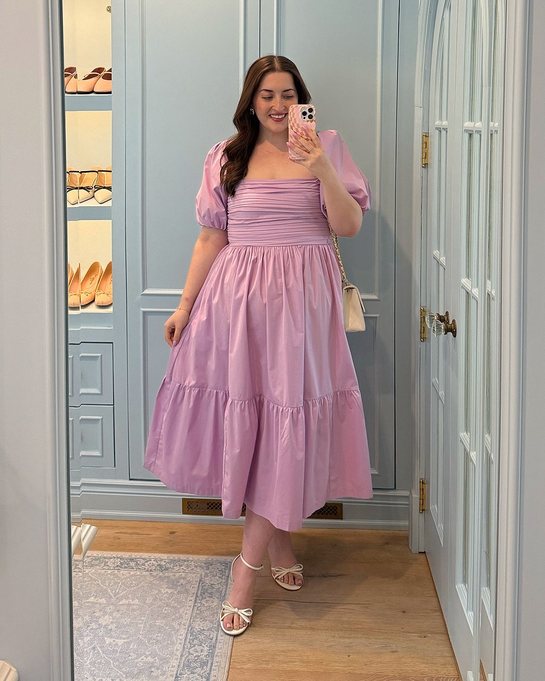This dress is pure spring romance. The soft lavender shade paired with the ruched bodice and puff sleeves creates a silhouette that feels both playful and elegant.