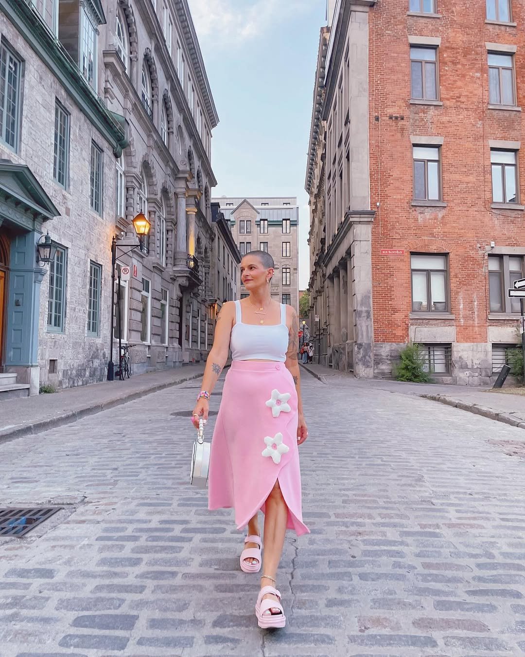 There’s something cinematic about strolling down a cobblestone street in soft pink. The white tank paired with a blush skirt decorated with floral appliqués creates a look that feels playful yet polished.