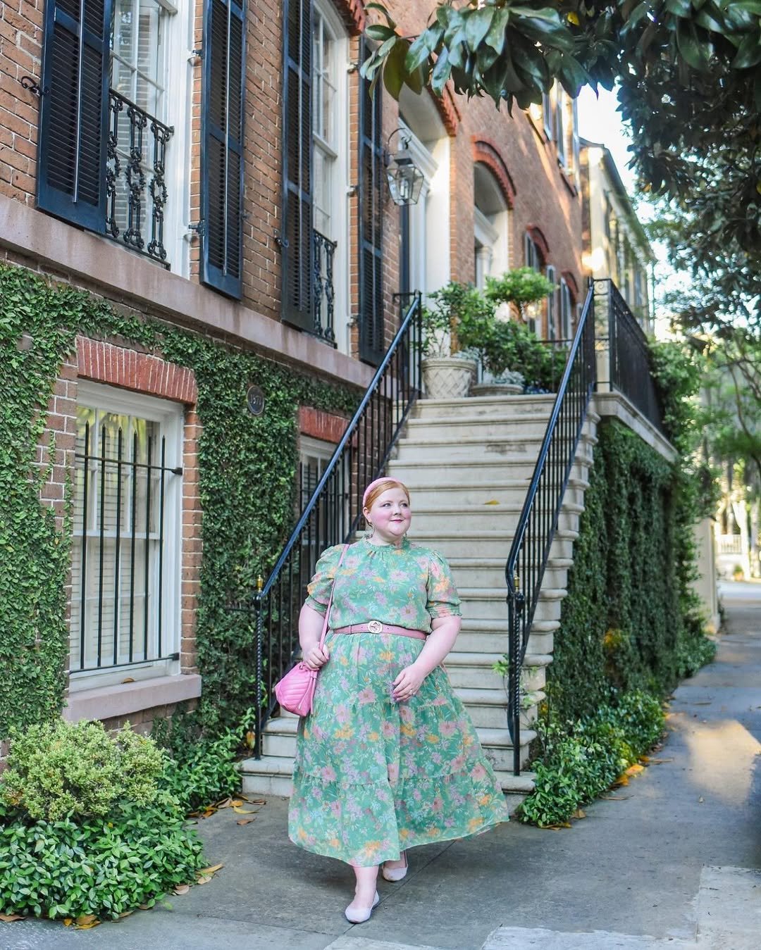 This outfit feels like stepping straight into a storybook Southern afternoon. The soft green floral dress, cinched with a delicate pink belt, creates a silhouette that feels both timeless and cheerful. Standing along that ivy-covered brick row, the whole moment feels charming in the most effortless way.