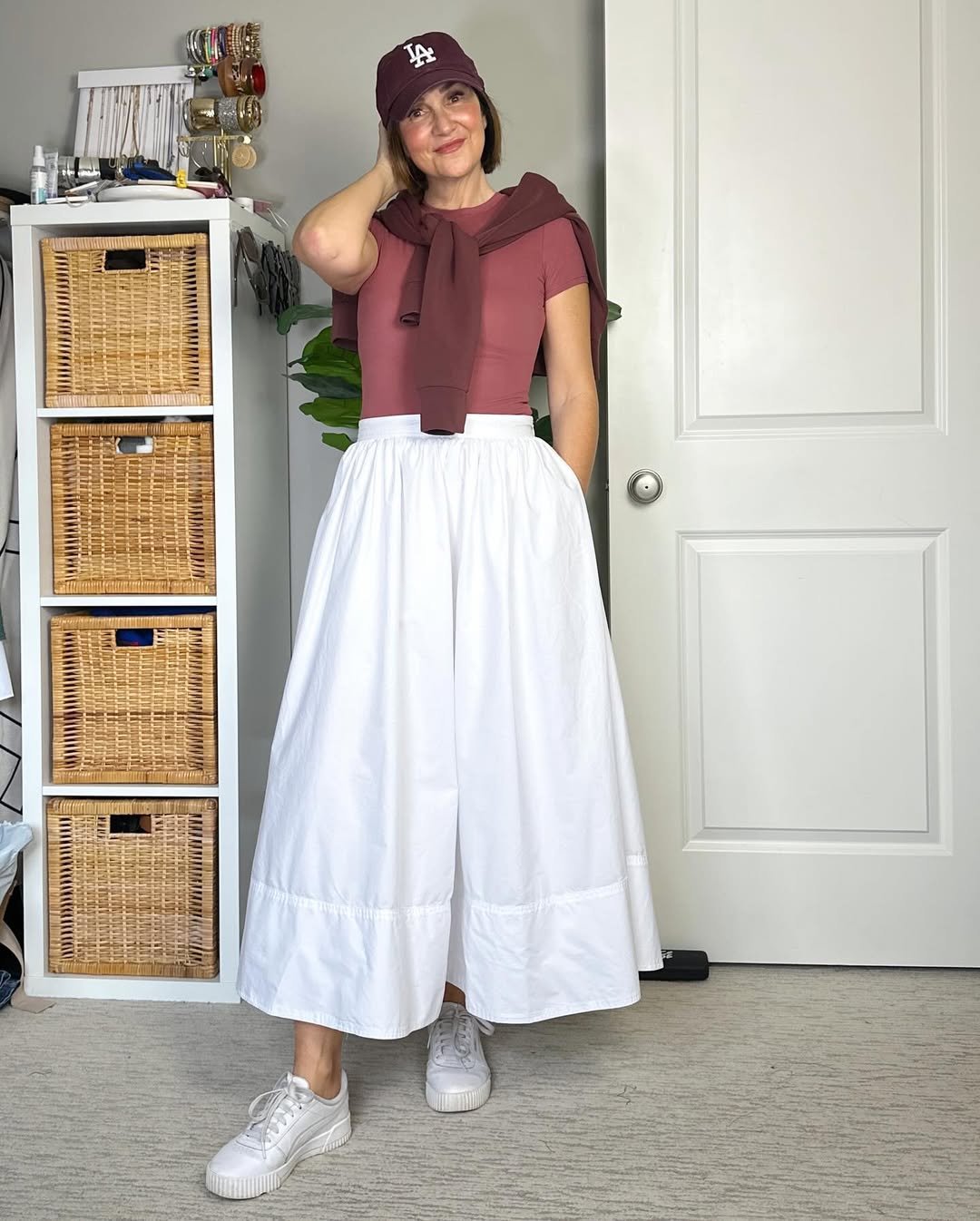 This look is the perfect reminder that feminine and sporty can absolutely coexist. A crisp white maxi skirt paired with a fitted tee instantly feels polished, but the baseball cap and sneakers keep the vibe relaxed and playful.