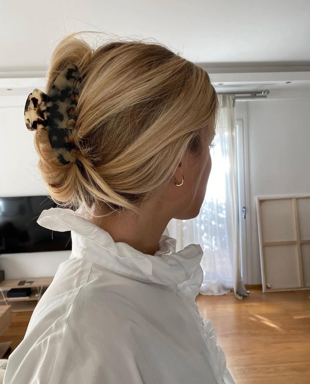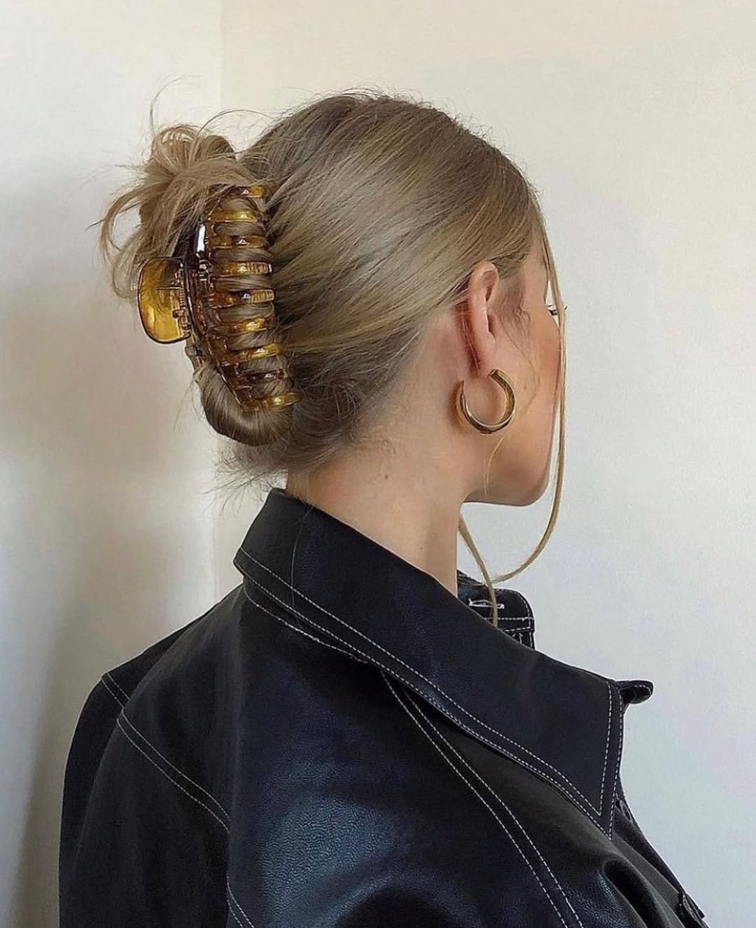 The oversized amber claw clip brings that gorgeous 90s nostalgia, but with a sleek, grown-up twist. The hair is gathered in a relaxed French twist, pieces tucked in just loosely enough to look chic but undone.