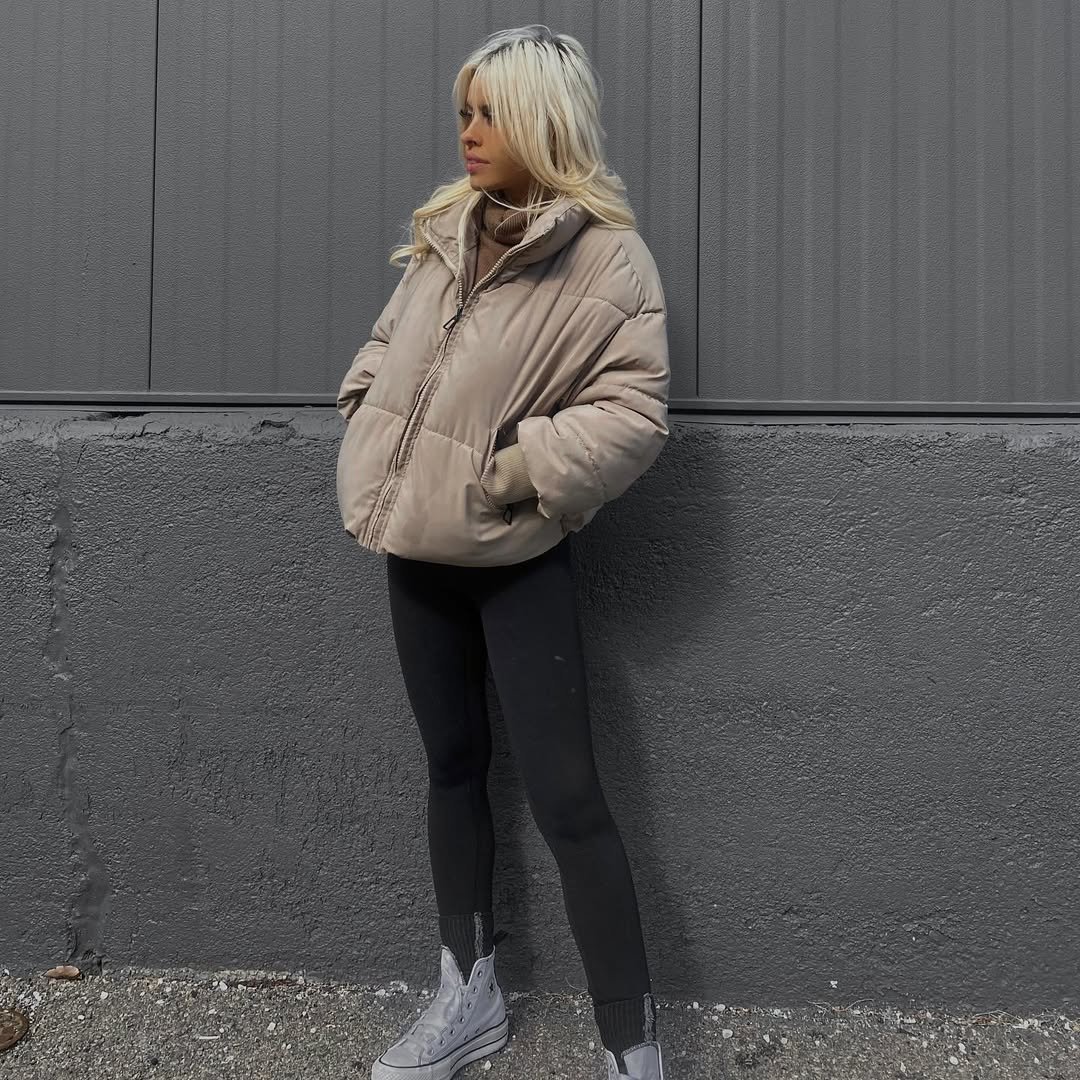 There’s something very cool-girl-incognito about this look — straight hair left natural, tucked into a cozy puffer, and worn with leggings and sneakers. It’s uncomplicated in the best way.