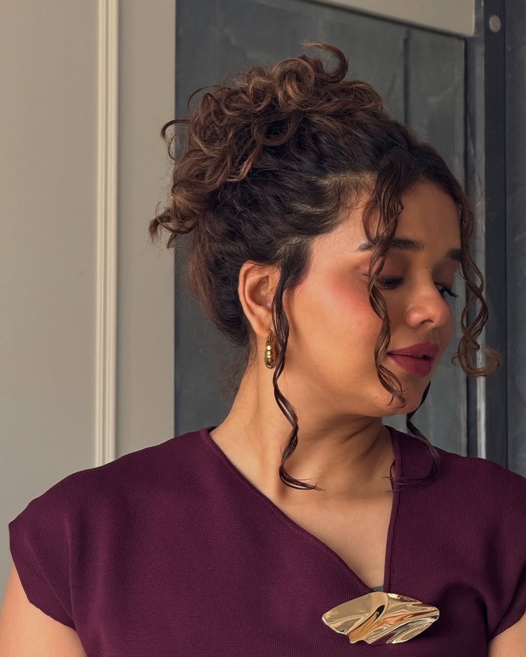 This curly updo is pure romance. The soft tendrils in front frame the face beautifully, balancing the fuller texture gathered at the top. It has this effortless “I woke up like this” vibe — even though we both know it’s secretly the result of perfect pinning.