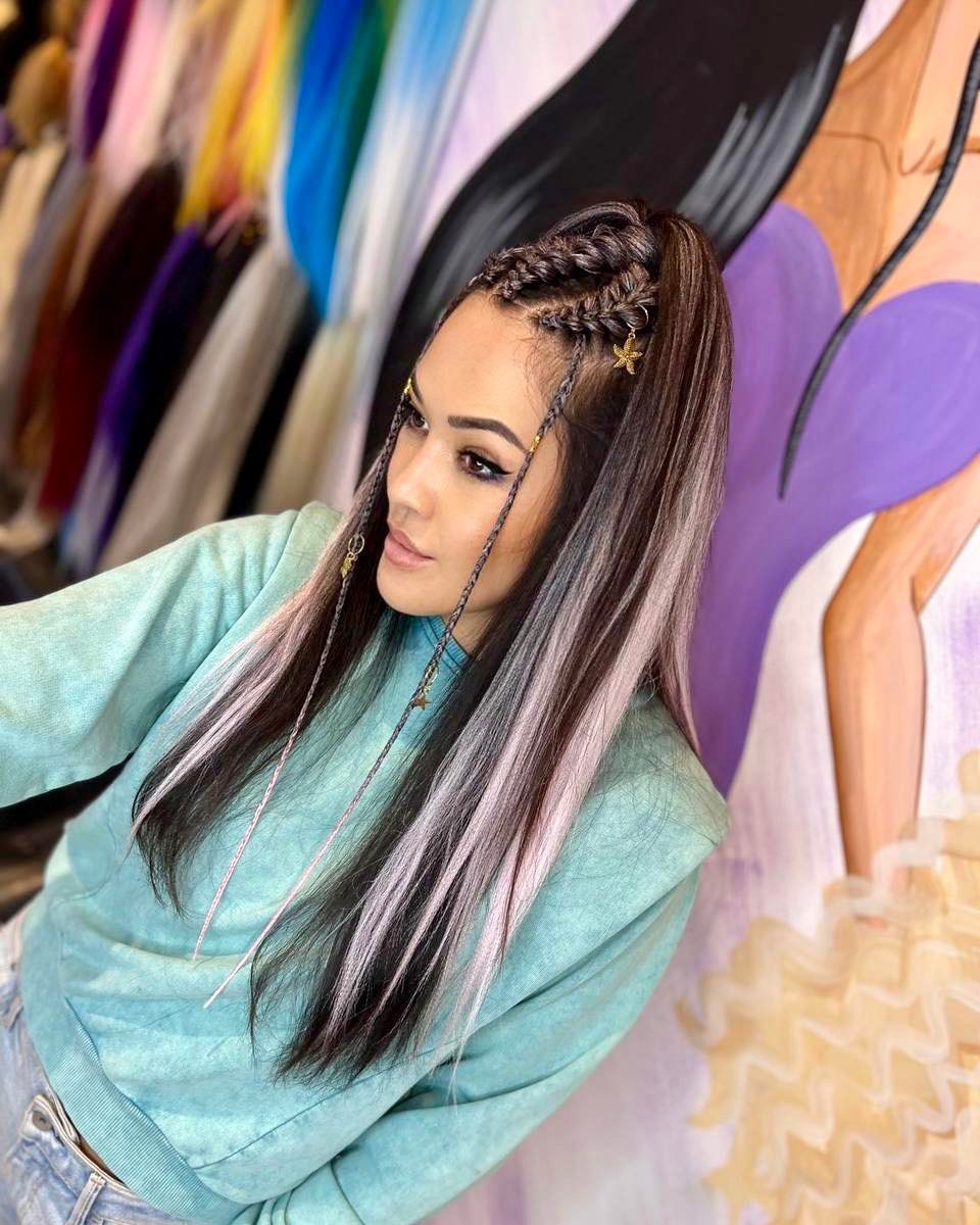This one turns a simple half-up hairstyle into something playful with braided strands and a mix of textures. The little metallic charms woven into the braids give the whole look a youthful, creative vibe.