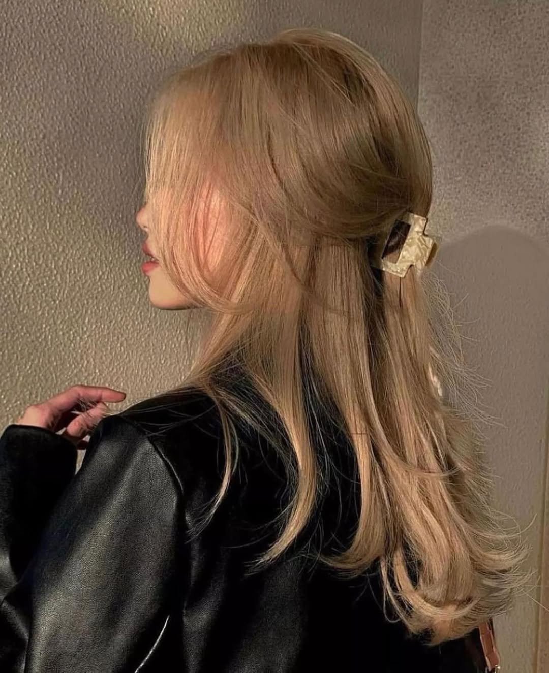 This look is all about softness meeting structure — airy layers framing the face and a square marble clip anchoring everything at the back. The contrast is so pretty: flowing movement below, clean lines above.
