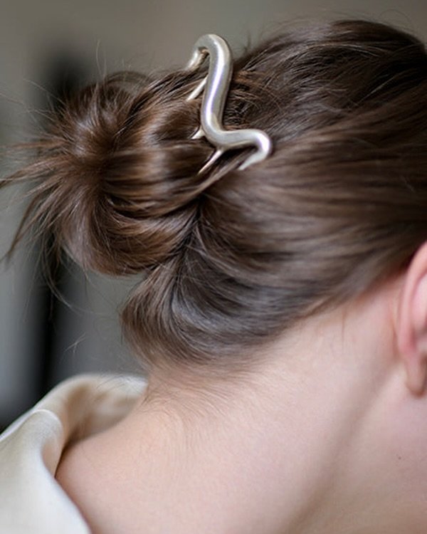 This bun has that refined, sculptural charm that Ariana’s pieces are known for — minimal, but with a whisper of artistry. The wavy metal clip tucked into a loose twist adds instant polish without trying too hard.