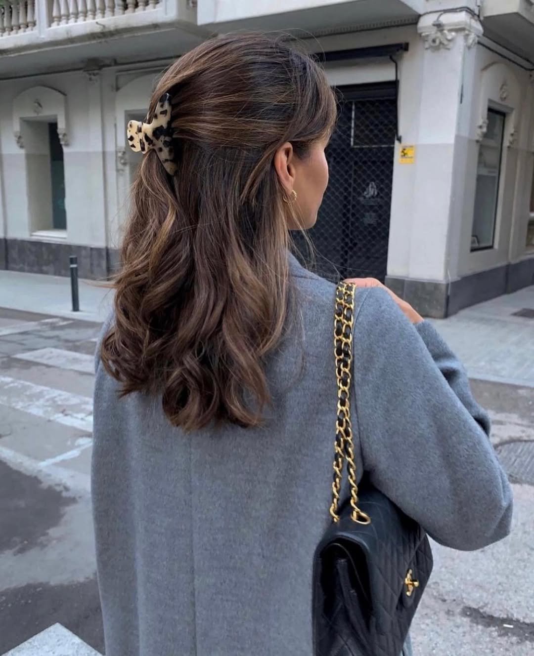 There’s something instantly charming about a half-up style paired with a tortoiseshell bow — it feels Parisian, polished, and a little bit flirty. The soft waves fall so effortlessly, creating that perfect “weekend stroll through the city” energy.