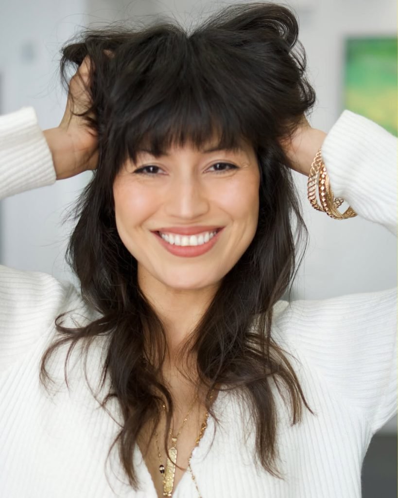 What anchors it all is the soft fringe, slightly undone and cut to frame the eyes like inked wisps. It’s giving downtown siren—equal parts mysterious and magnetic. There’s a lived-in texture here that leans rock ‘n’ roll, but the polish in the styling keeps it chic rather than chaotic.