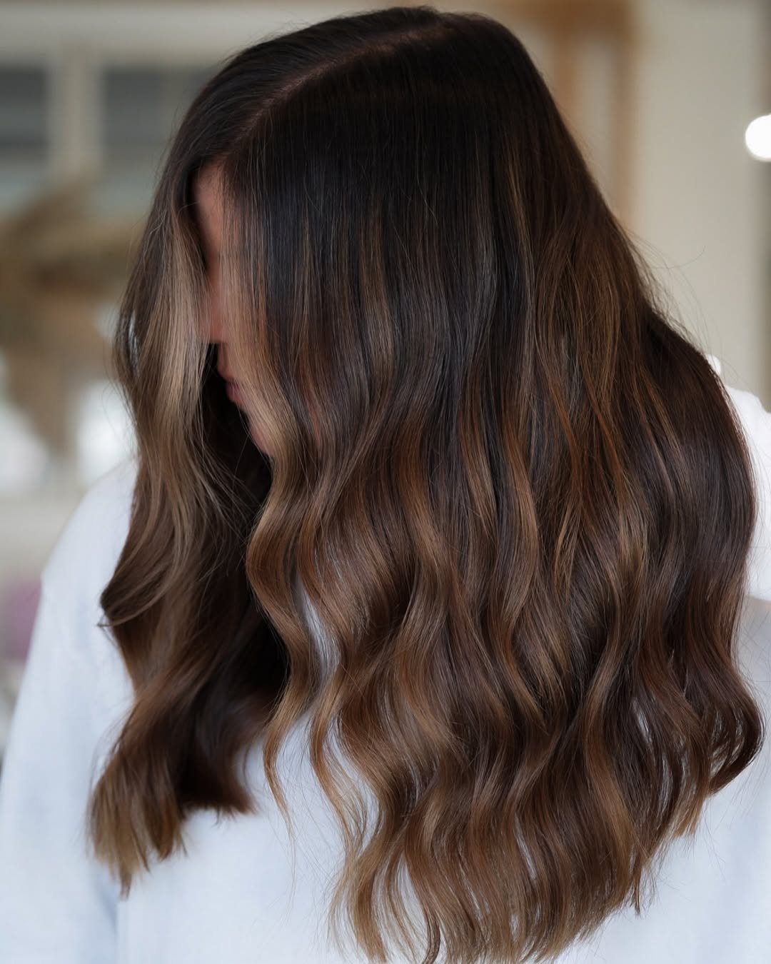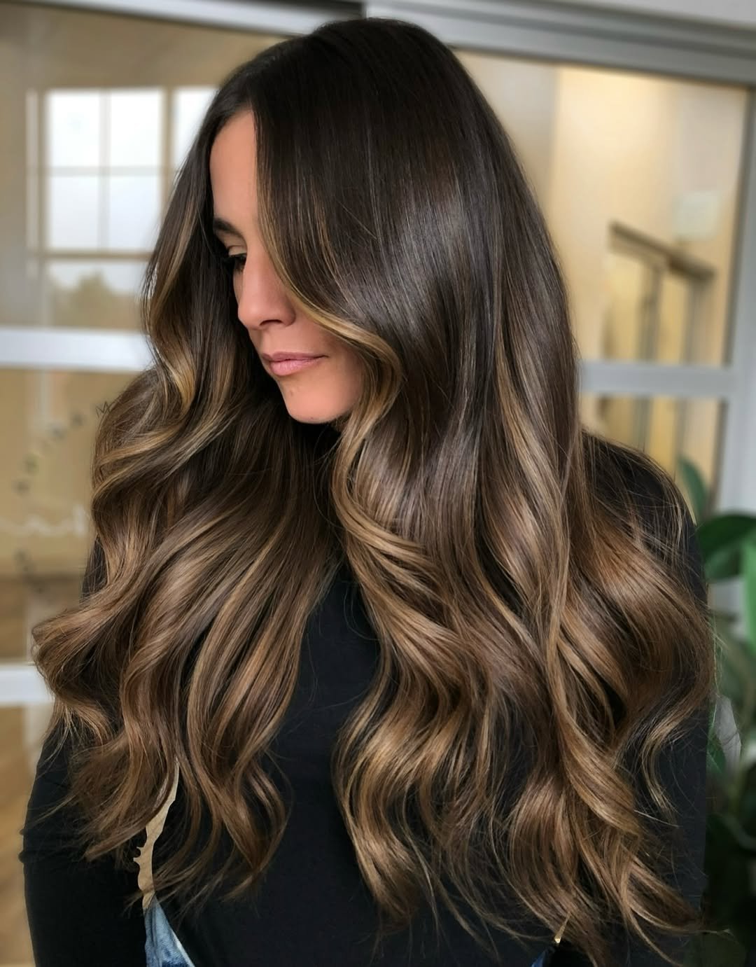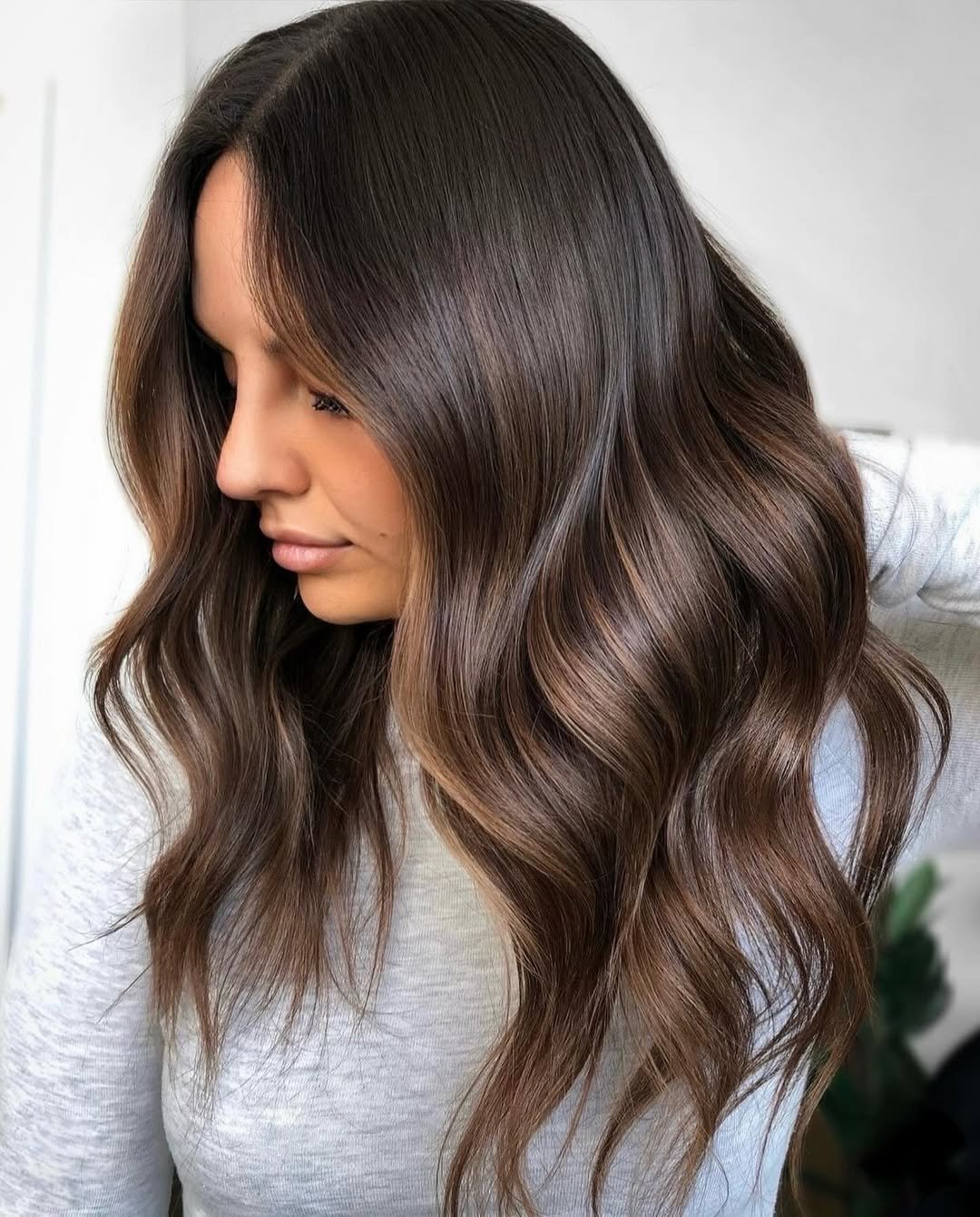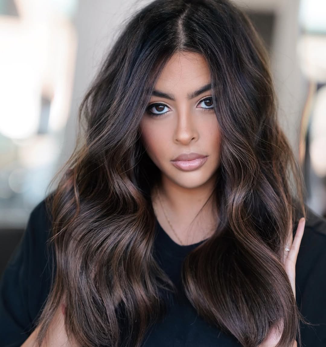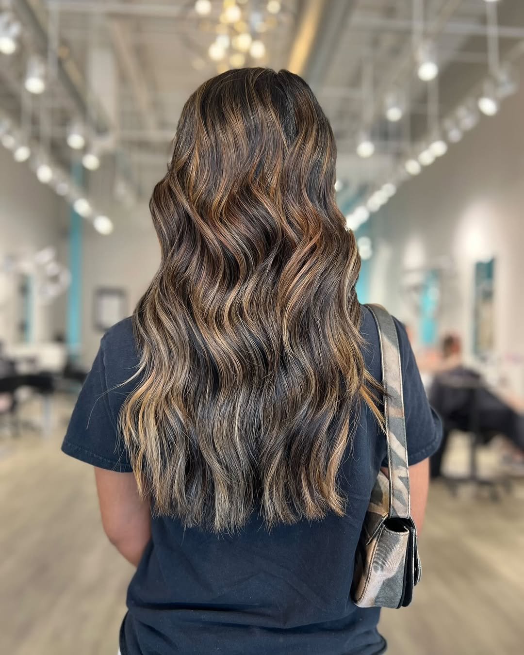This is espresso with a whisper of honey — subtle balayage painted in a way that looks sun-kissed but still grounded in rich brunette depth. The long waves give the color a romantic, flowing vibe that feels effortlessly glamorous.