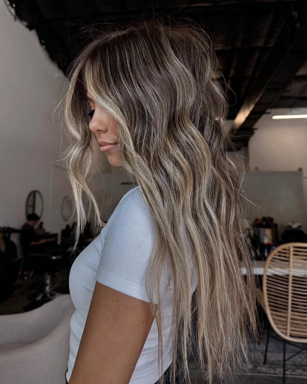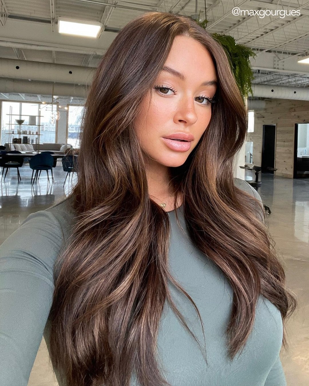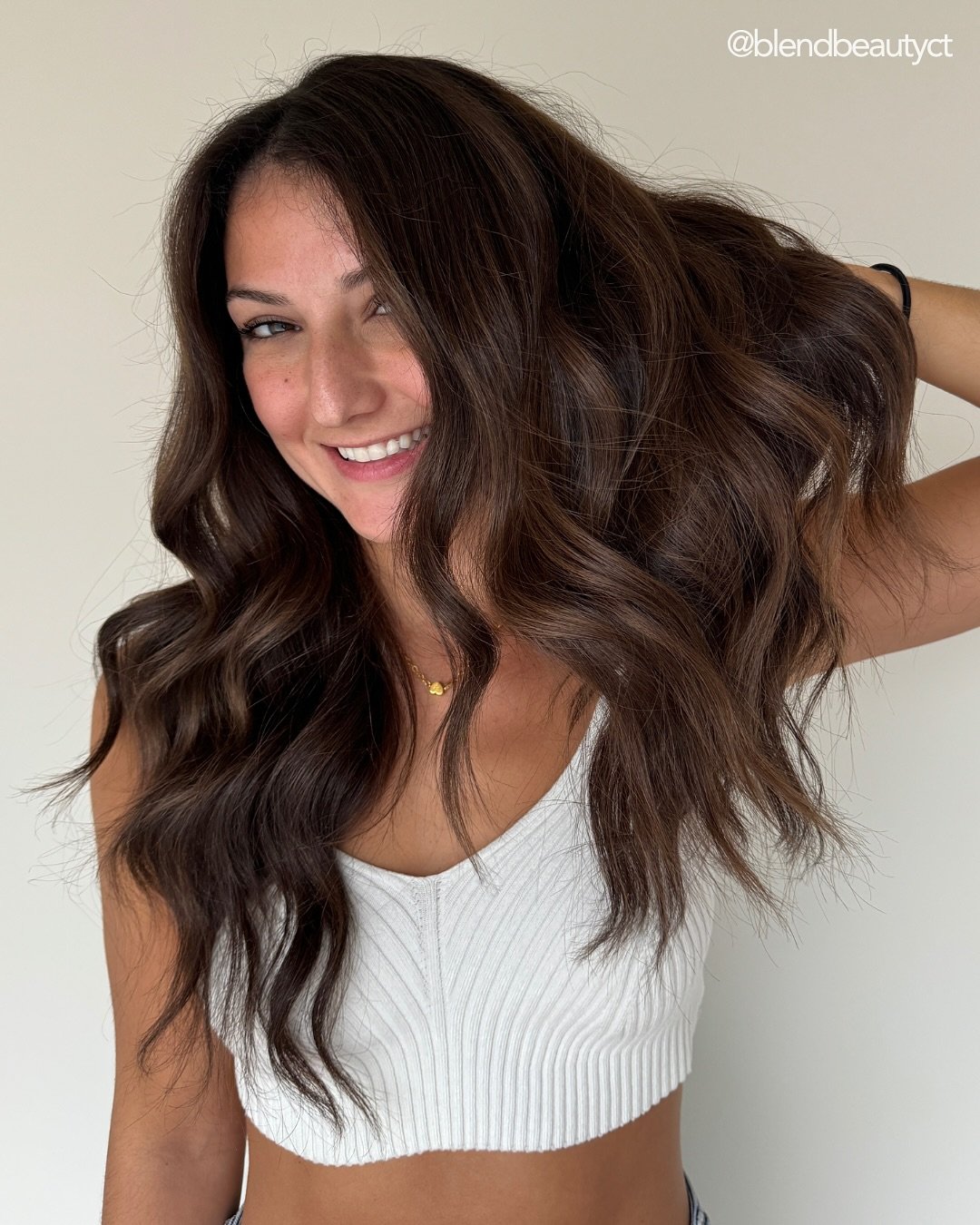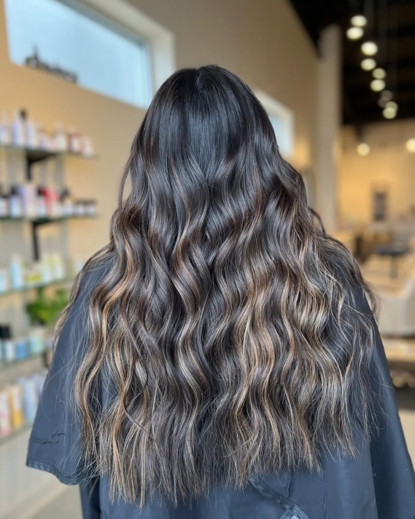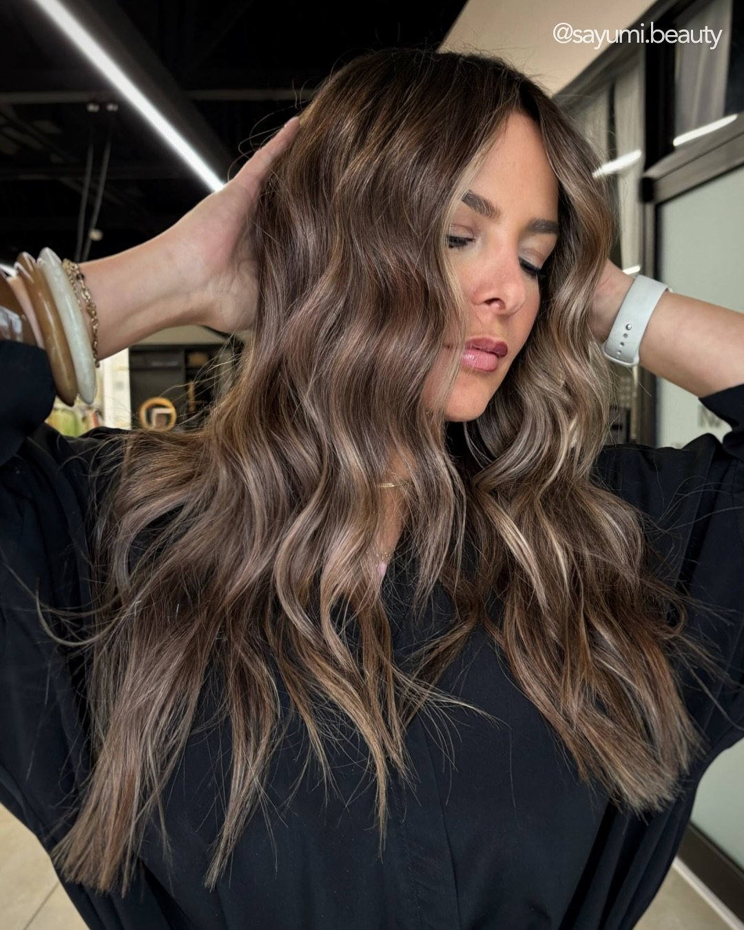 This is espresso with a whisper of honey — subtle balayage painted in a way that looks sun-kissed but still grounded in rich brunette depth. The long waves give the color a romantic, flowing vibe that feels effortlessly glamorous.
