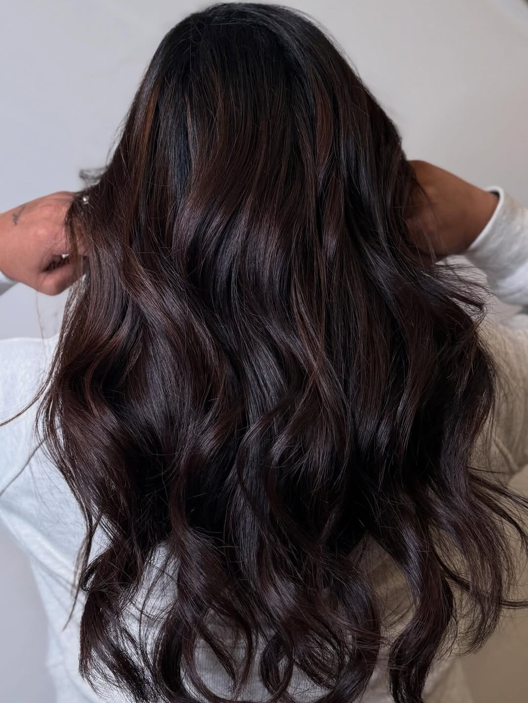 These waves have that dreamy, slow-Sunday softness — rich espresso tones woven through long, glossy hair that catch the light in the prettiest way. It feels warm, dimensional, and lived-in, like the perfect balance between bold color and natural depth.