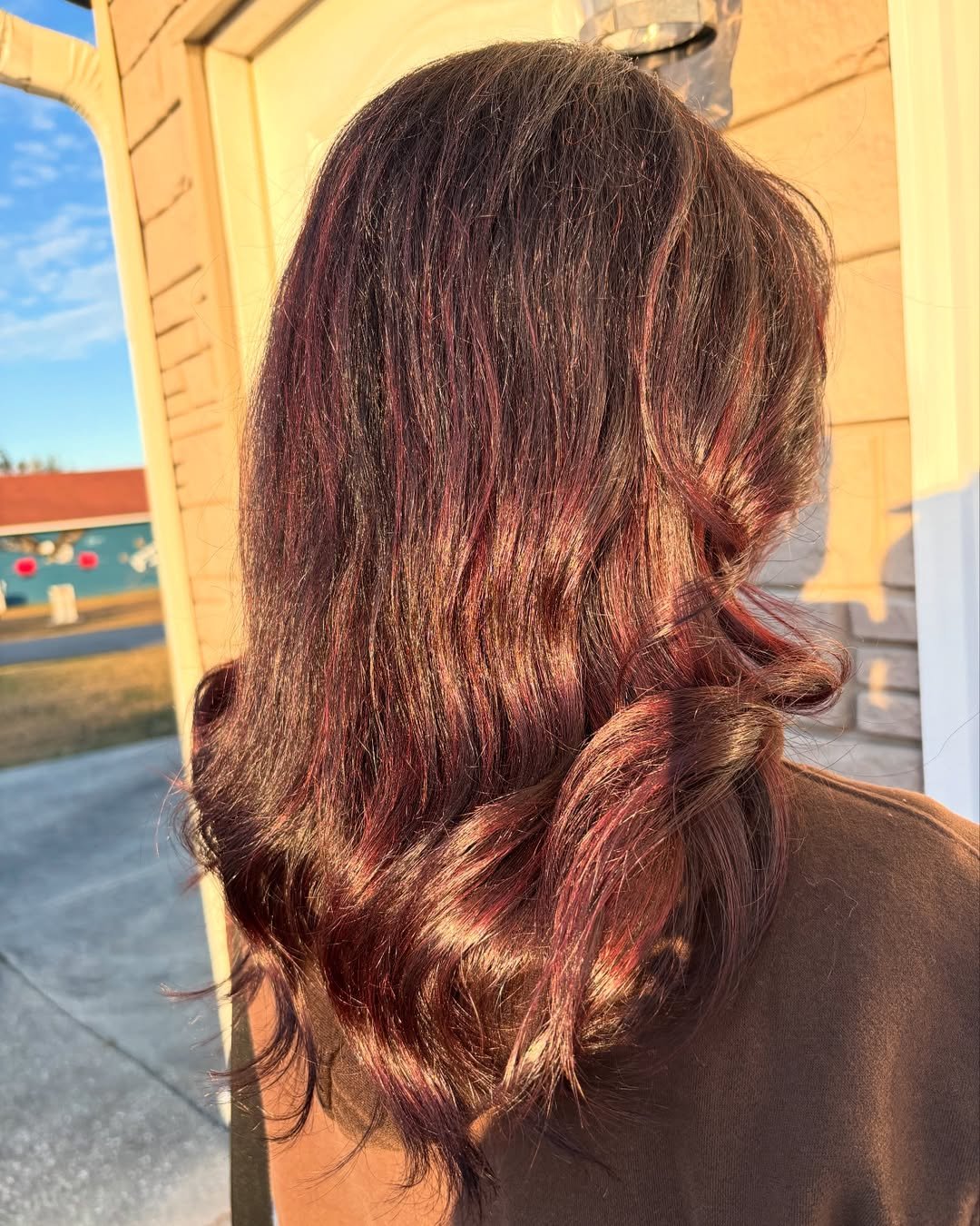 This look takes espresso and adds a playful twist — hints of berry-red woven subtly through the dark base so they shimmer when the light hits. It’s unexpected but still wearable, giving classic brunette hair a fresh, artistic edge.