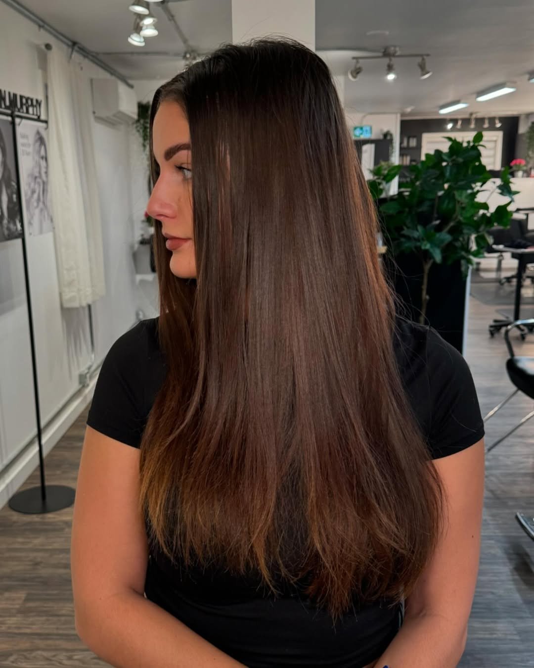 This brunette is pure velvet — smooth, deep, and impossibly glossy. The subtle warmth peeking through the mid-lengths adds just enough brightness to keep things fresh and multidimensional.