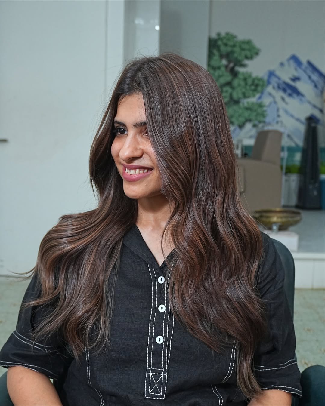 This look is pure luxe — deep espresso tones flowing through long, sculpted waves that shine with every tiny movement. The color feels rich but soft, almost like velvet under good lighting. It gives that “effortlessly expensive” vibe without trying too hard.