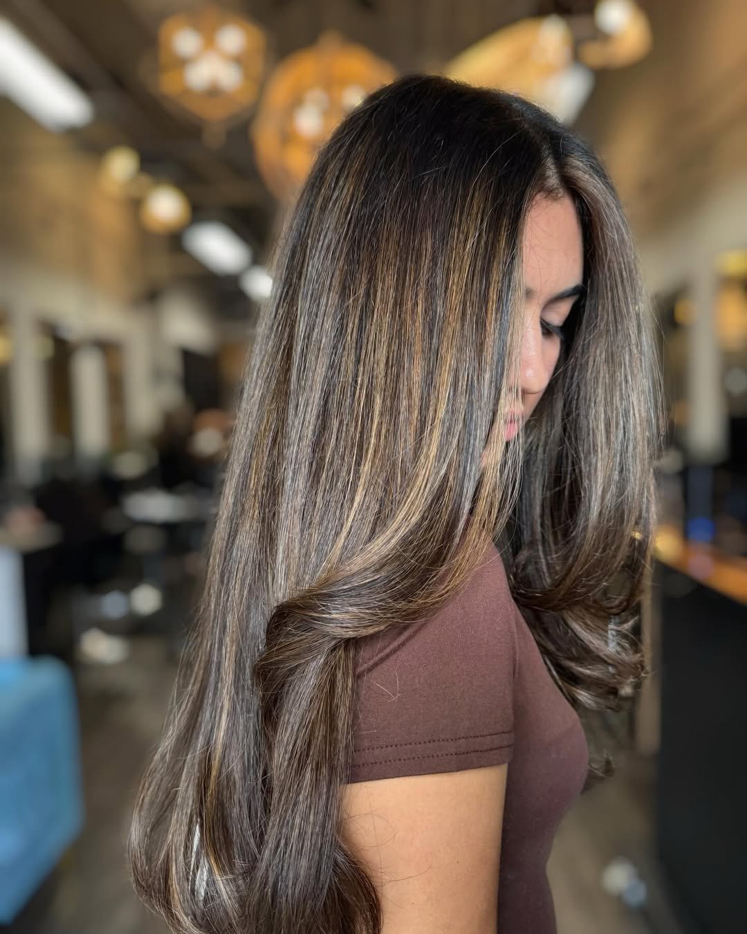 It’s stunning in its simplicity, proving you don’t always need heavy dimension to make dark hair feel alive and dynamic.