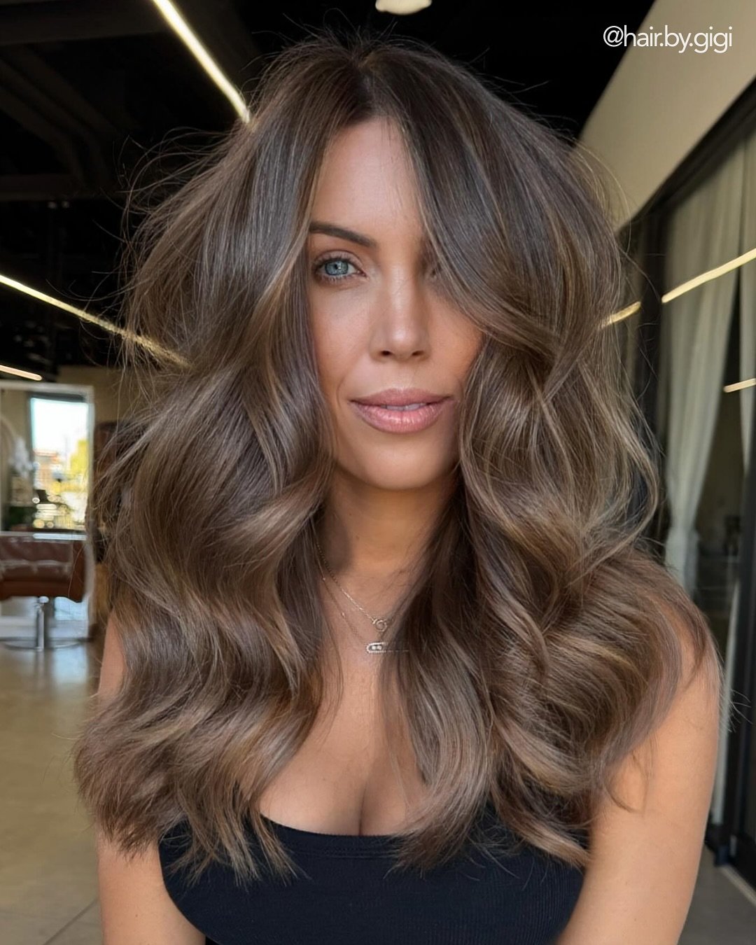 Here’s a cooler take on espresso — a soft, earthy brunette with slightly ashy edges that give it a modern, airy vibe. The long waves add body, making the color feel dimensional without loud contrast.