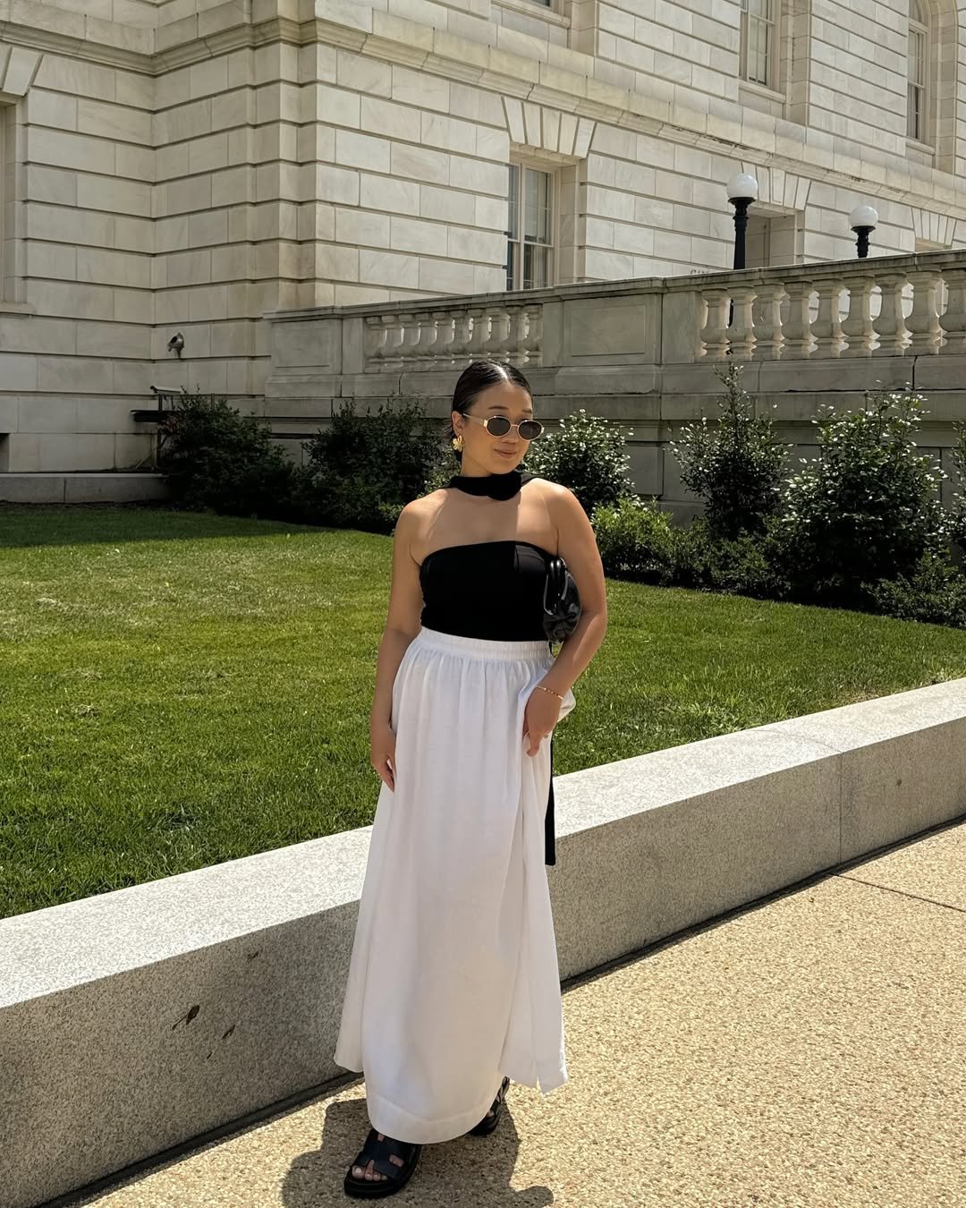 This pairing feels timeless in the most effortless way. A fitted black top with a flowing white skirt creates that contrast that always works, no matter the setting. It’s simple, but it carries presence.