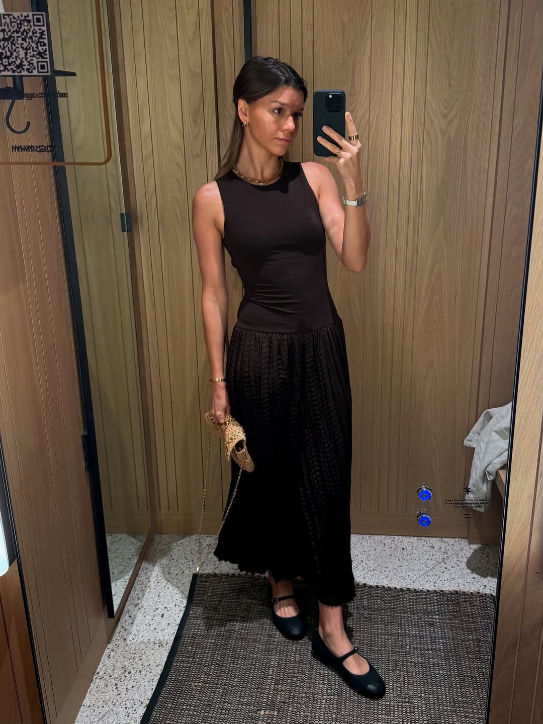 A fitted black top flows into a textured skirt, creating a quiet contrast that feels both structured and relaxed. The silhouette is simple, but the details, like the fabric and subtle movement, keep it interesting.