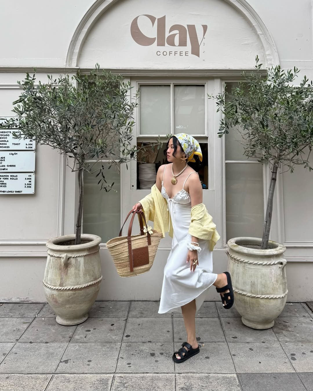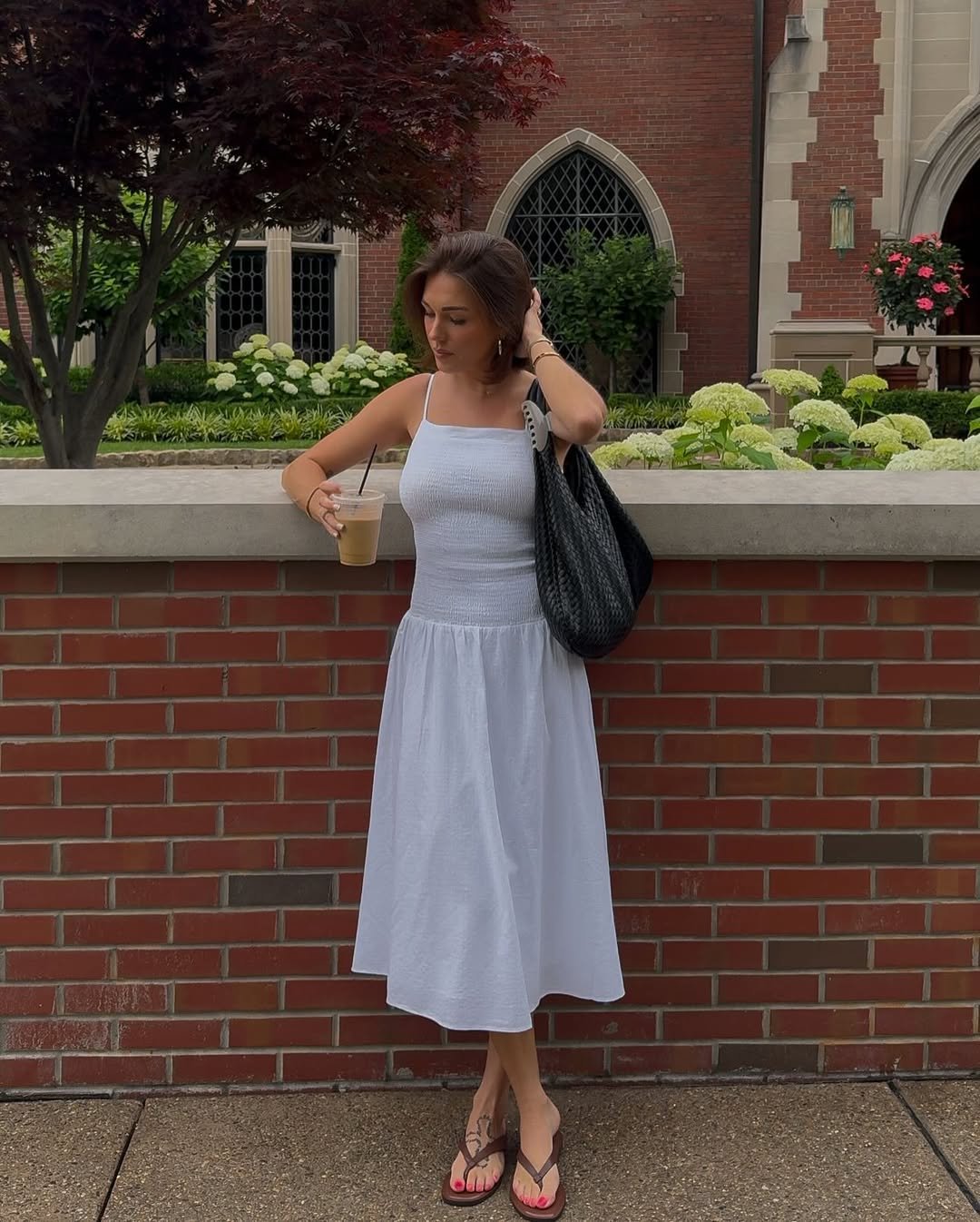 A simple white midi with thin straps and a relaxed bodice brings that effortless daytime energy. Paired with flat sandals and an iced coffee in hand, it leans into those in-between moments, wandering streets, stopping wherever looks inviting.