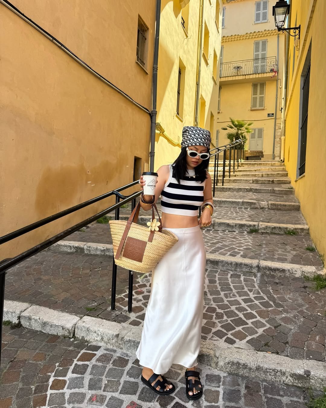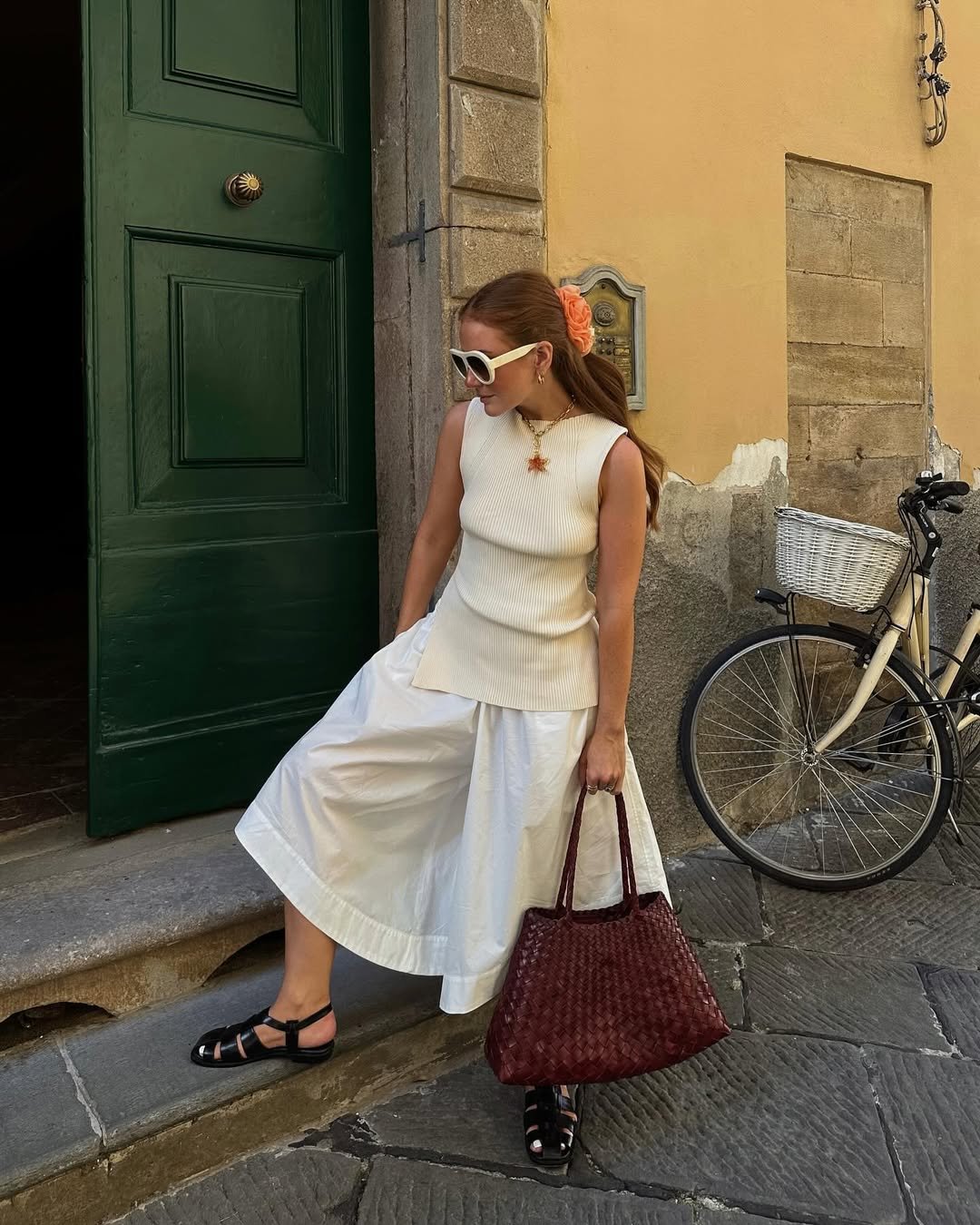 This look leans into that quiet luxury energy Europe does so well. A ribbed knit top paired with a crisp white skirt feels clean, breathable, and just a little undone in the best way. It’s the outfit you reach for when comfort matters, but style still leads.