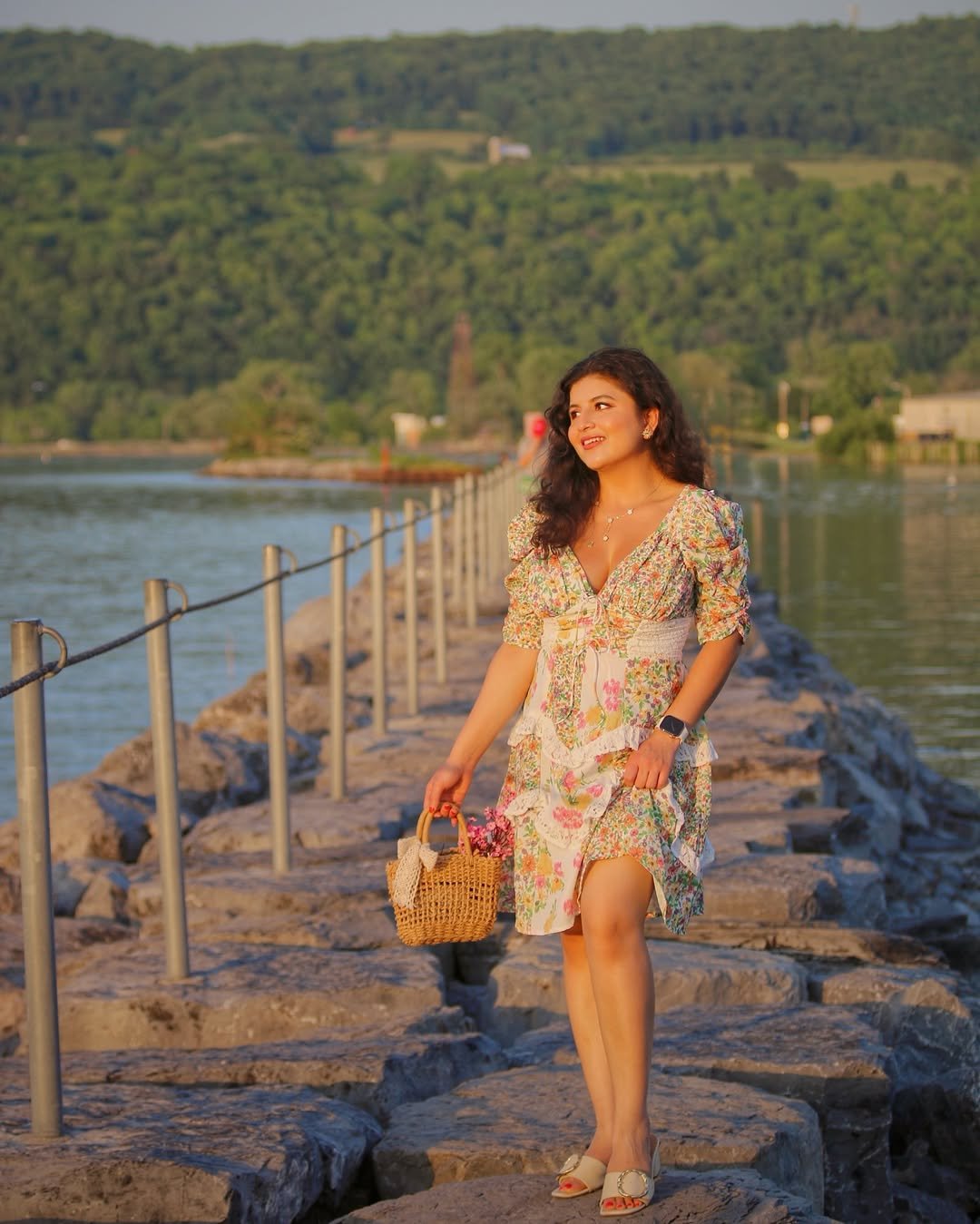 Walking along the water in a soft floral dress like this feels straight out of a summer daydream. The corset-style bodice gives structure, while the puff sleeves and flowing skirt soften everything back down.