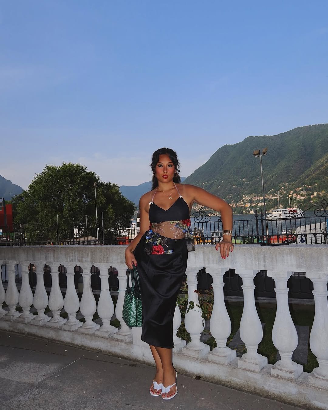 There’s something about black satin against a sunlit waterfront that just feels cinematic. The delicate halter top paired with a fluid midi skirt moves with an ease that feels made for golden hour walks along the lake. Embroidered florals catch the light in the most subtle way, adding just enough detail without interrupting the mood.