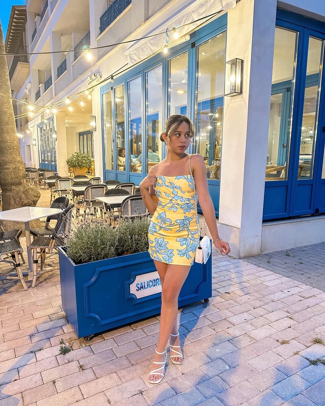 It feels young, fresh, and perfect for evenings that start with dinner and end with a walk under string lights. Add strappy heels, and it’s done.