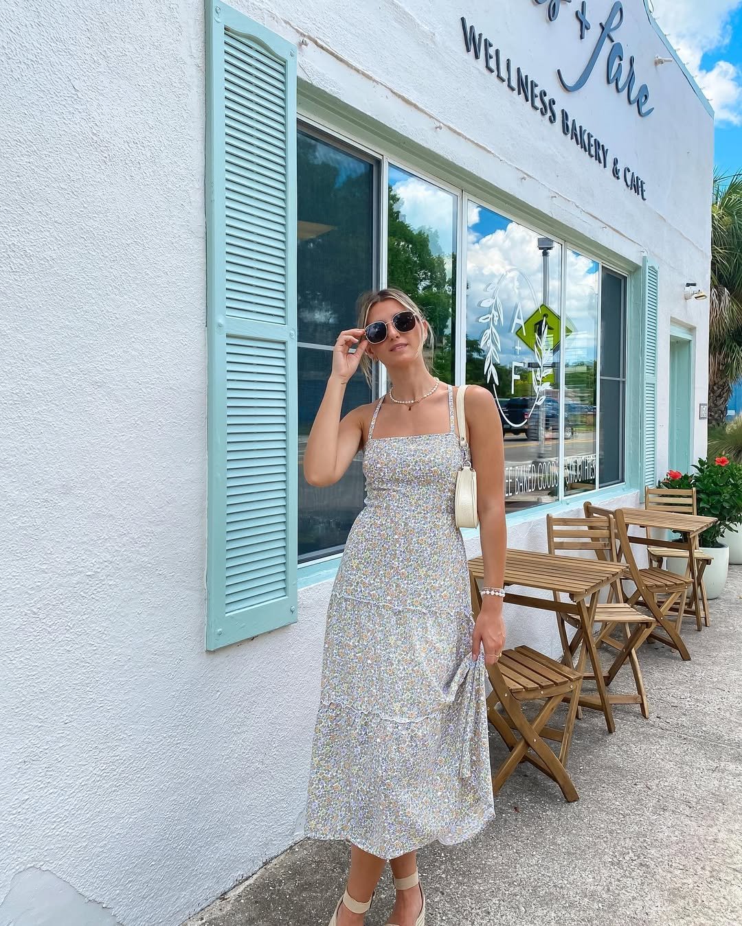 A delicate floral midi outside a charming café feels like summer in its most relaxed form. The fit is easy, the print is subtle, and everything about it feels wearable without losing charm.