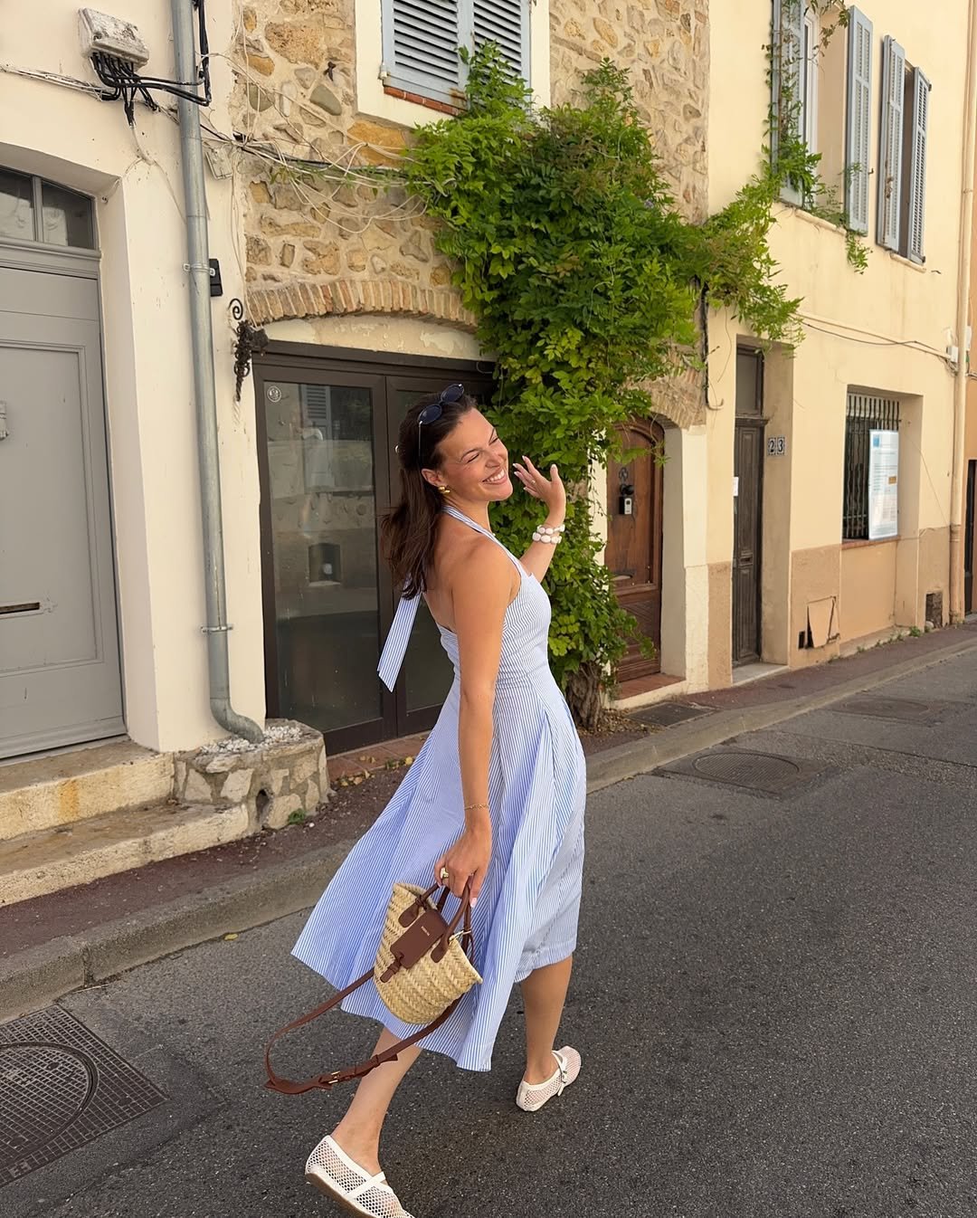 A striped halter dress with a soft A-line shape feels made for wandering quiet streets. The fabric moves just enough, and the subtle pattern keeps it interesting without overpowering the look.