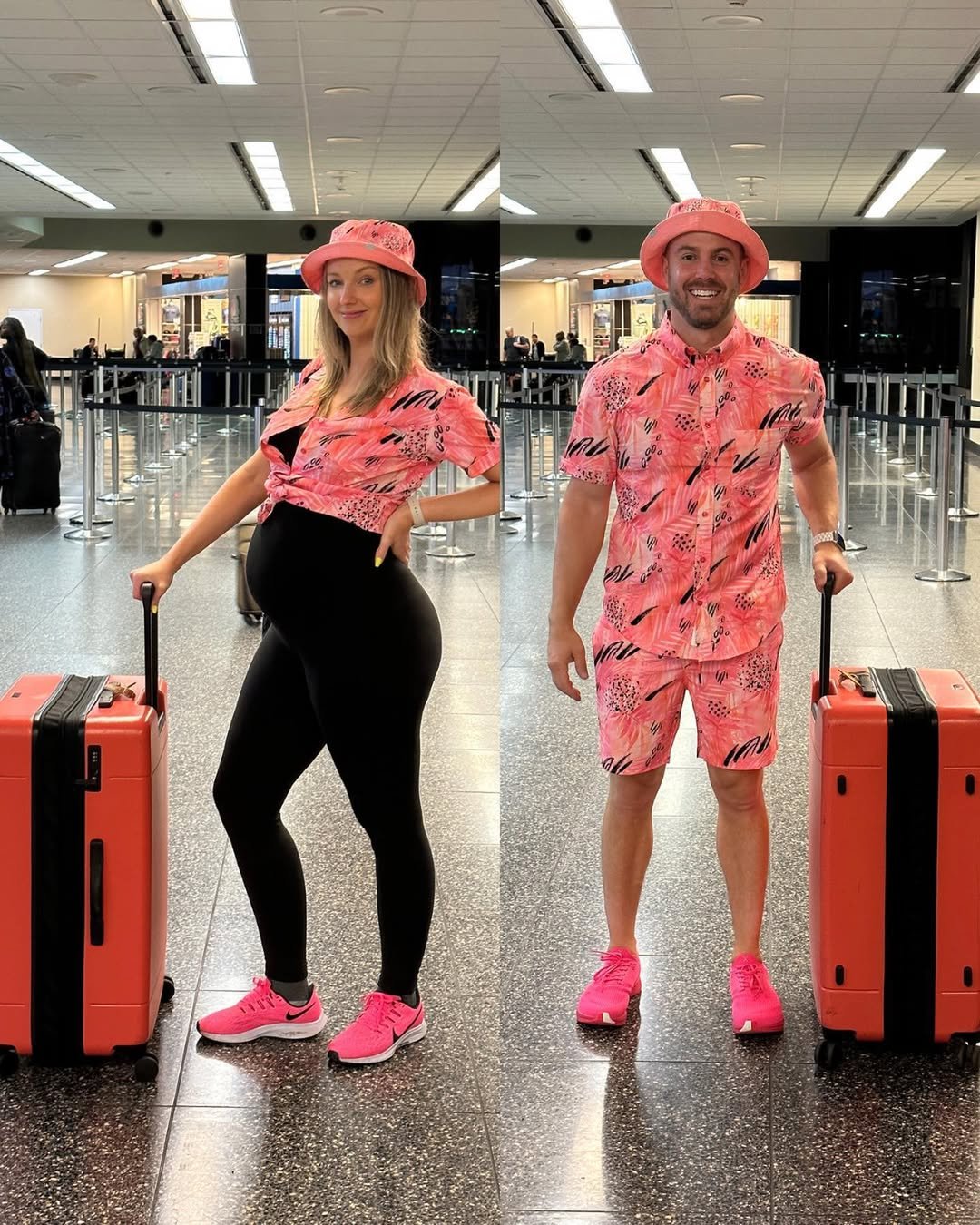 Matching travel outfits always feel intentional, and this one nails it. Coordinated prints, bold pink accents, and practical silhouettes make airport style feel fun instead of stressful.