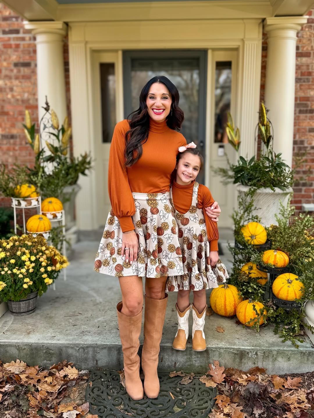 This matching fall look feels straight out of a cozy storybook. Warm rust tones, playful prints, and those coordinating skirts create a look that’s sweet without tipping into costume territory. It’s seasonal, thoughtful, and full of heart.