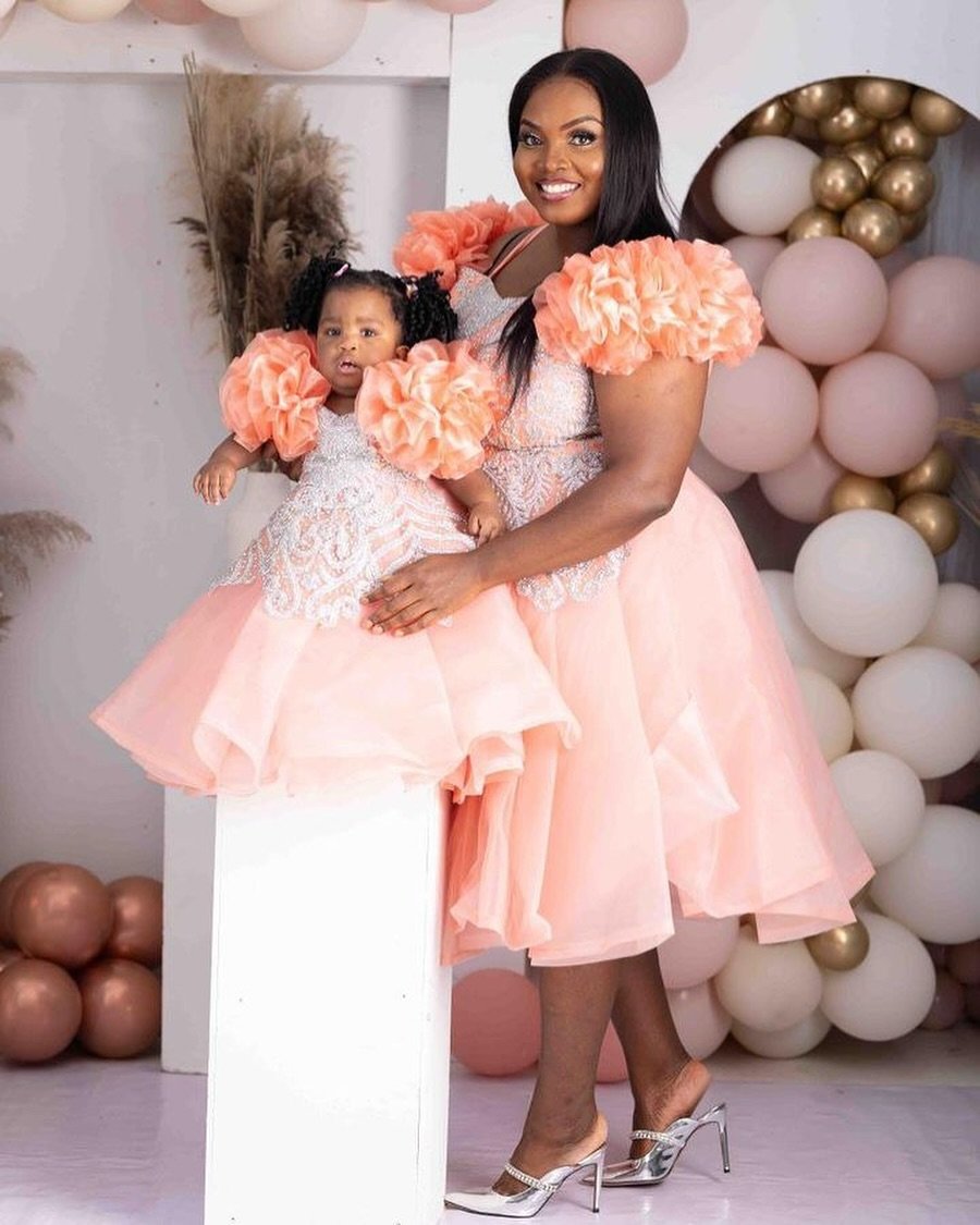 This matching moment feels pure joy. Soft peach layers, statement florals, and a sense of occasion that’s impossible to miss.