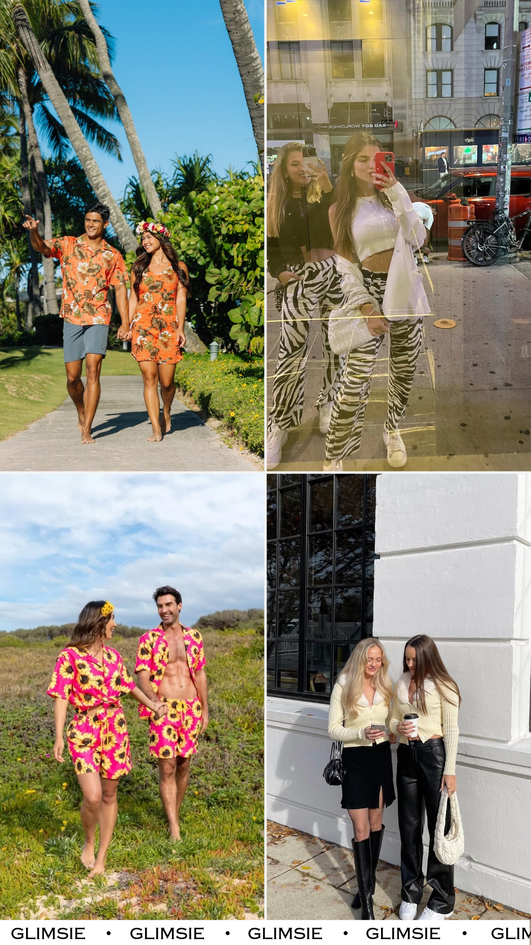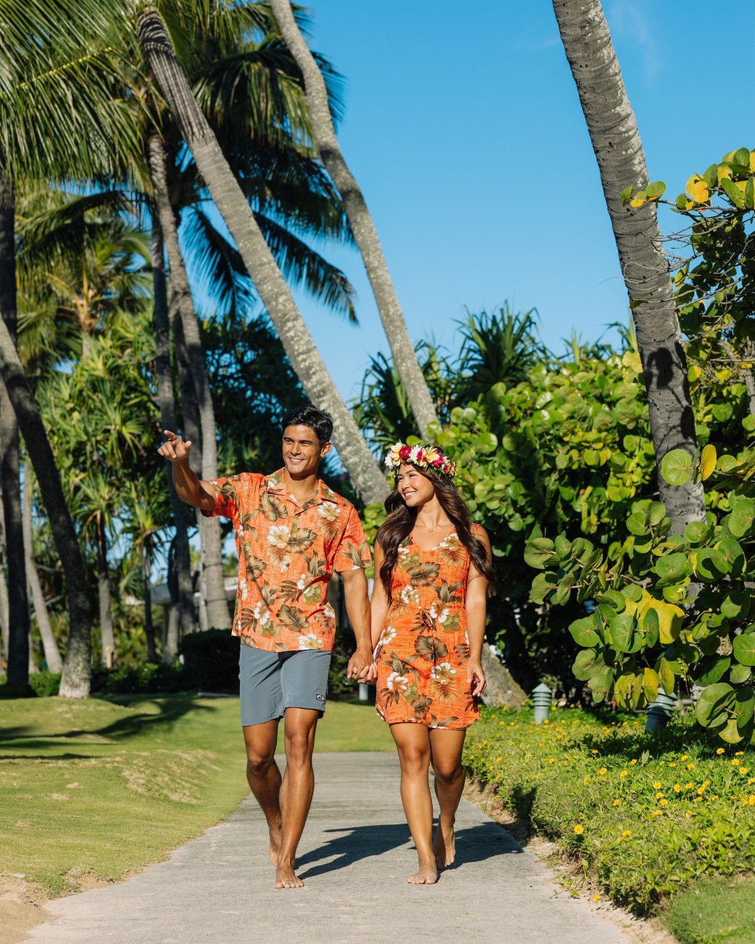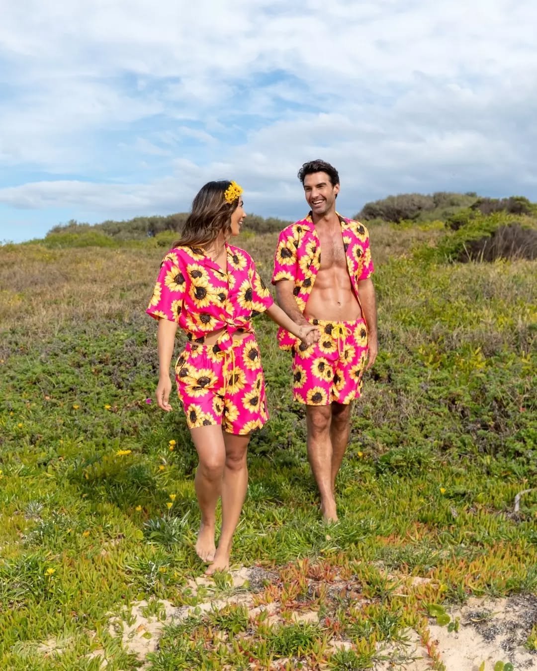 Nothing says vacation ease quite like matching tropical prints under palm trees. The warm orange tones instantly connect the looks, while the relaxed cuts keep everything light and effortless. It feels joyful, sunny, and perfectly in sync.
