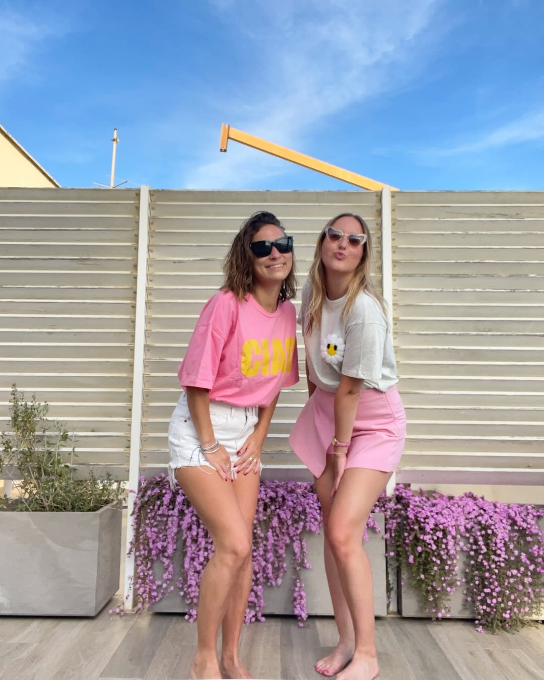 Easy tops, denim shorts, and sun-warmed neutrals make this pairing feel relaxed and real. The looks aren’t identical, but the vibe is completely in sync.