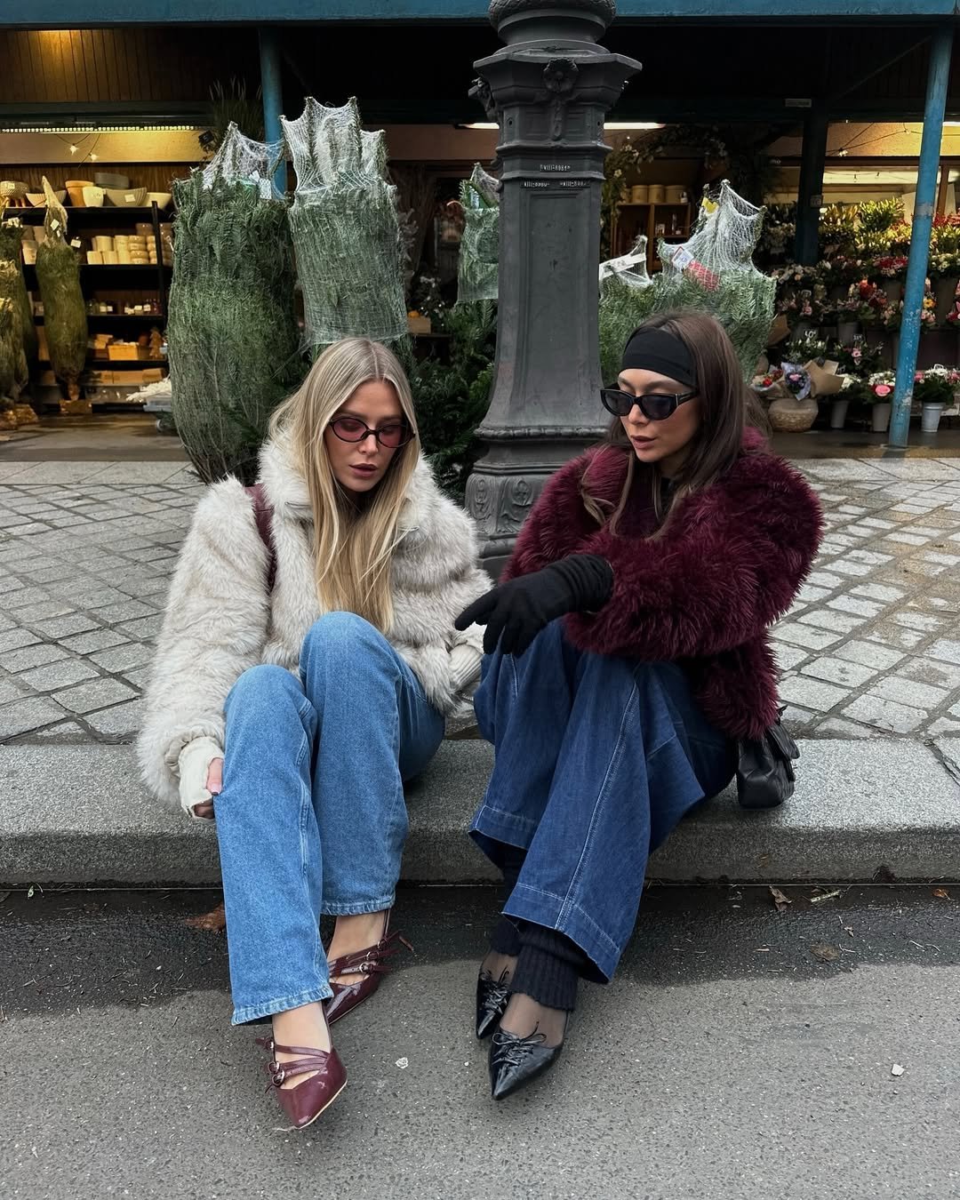 There’s a cinematic stillness to this moment. Faux fur textures, deep wine tones, and relaxed denim create a look that feels both undone and refined. Like an accidental stop that turns into the best photo of the day.