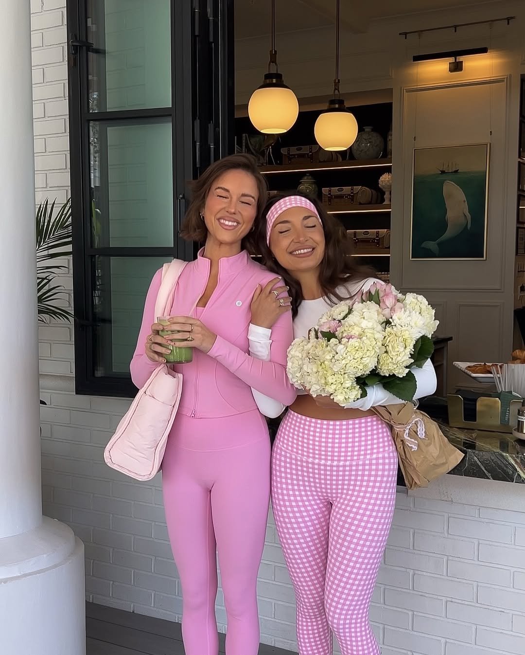 This matching pink athleisure moment feels like the definition of everyday ease. Coordinated shades, sleek silhouettes, and soft fabrics give it that “we didn’t plan this, but it worked” energy. It’s relaxed, cheerful, and very now.