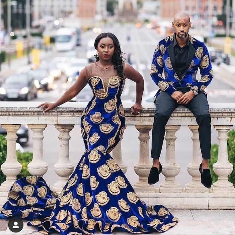 This matching look is powerful from the first glance. Deep blue fabric, intricate gold detailing, and silhouettes that feel ceremonial yet modern create a striking visual story.