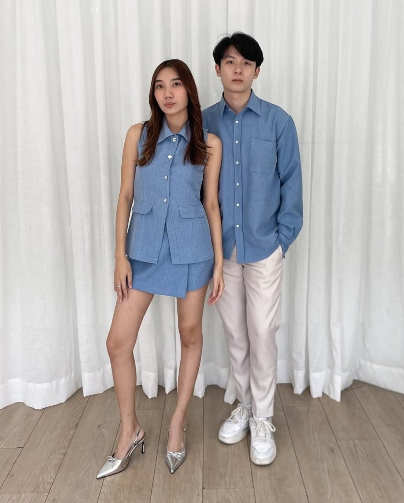 This matching set leans into quiet confidence. Powdery blue tailoring feels fresh and intentional, with silhouettes that mirror without copying. It’s minimal, calm, and very now.
