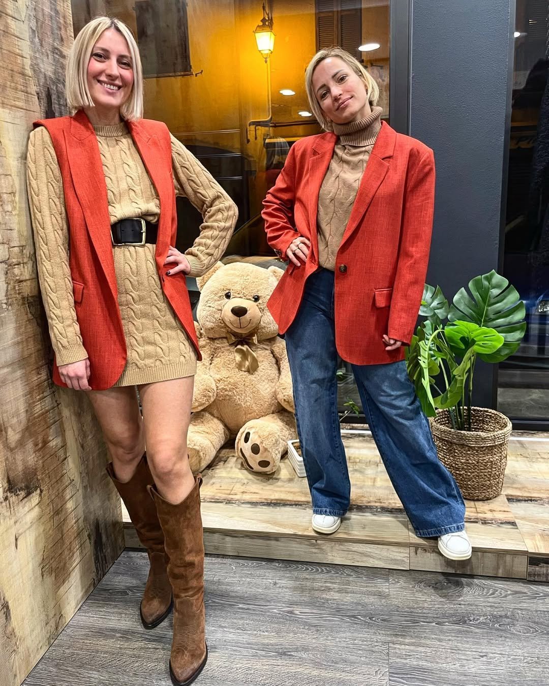 Rust-toned blazers and cozy knits bring warmth, while denim keeps the look grounded. There’s personality here, a little playful, a little bold.