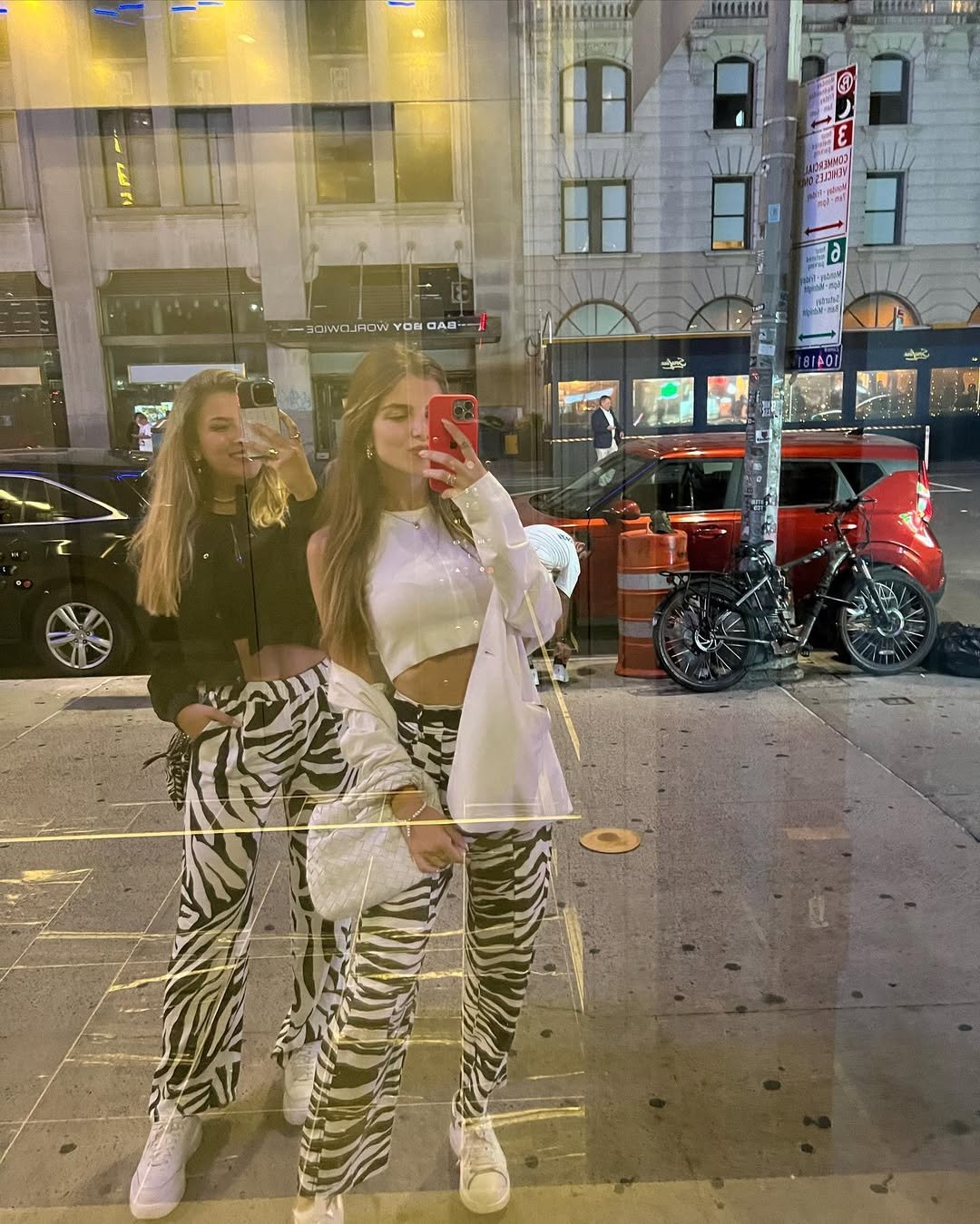 Matching zebra-print trousers instantly set the tone here. Paired with cropped tops and sneakers, the look feels spontaneous and fun, like a night that didn’t need a plan.