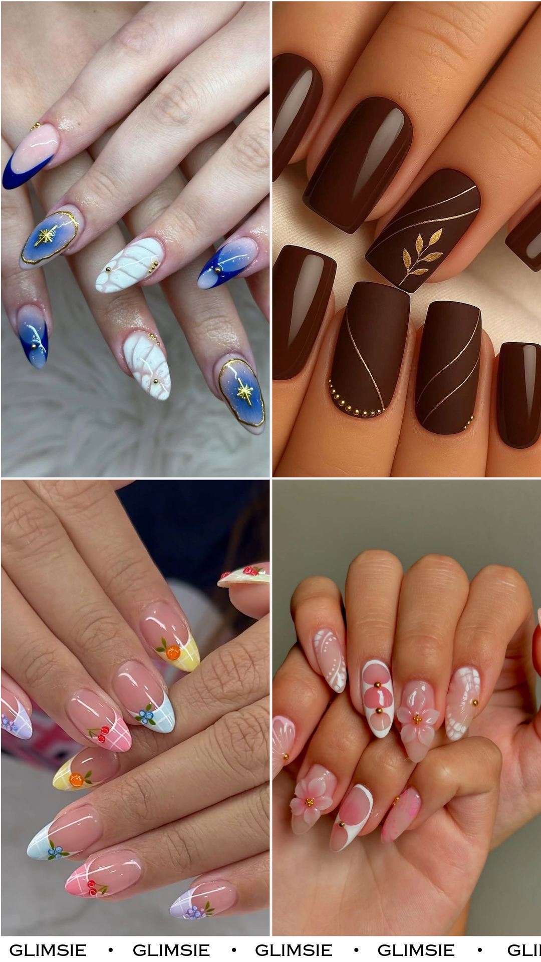 These nails lean into soft neutrals with delicate floral accents and tiny gold details. The muted tones make it super wearable, while the design keeps it from feeling basic.