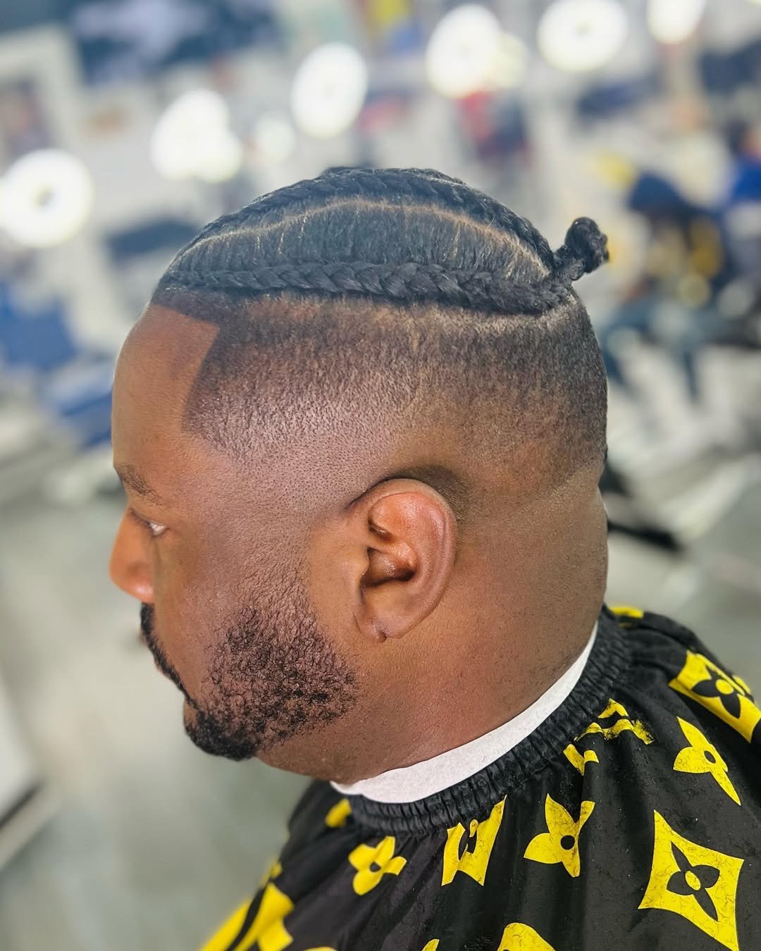 But what elevates this look is the flawless taper. The fade melts seamlessly from temple to nape, creating a smooth contrast that amplifies the braid pattern above. It’s minimalist in concept but bold in execution — a visual balance of control and edge.
