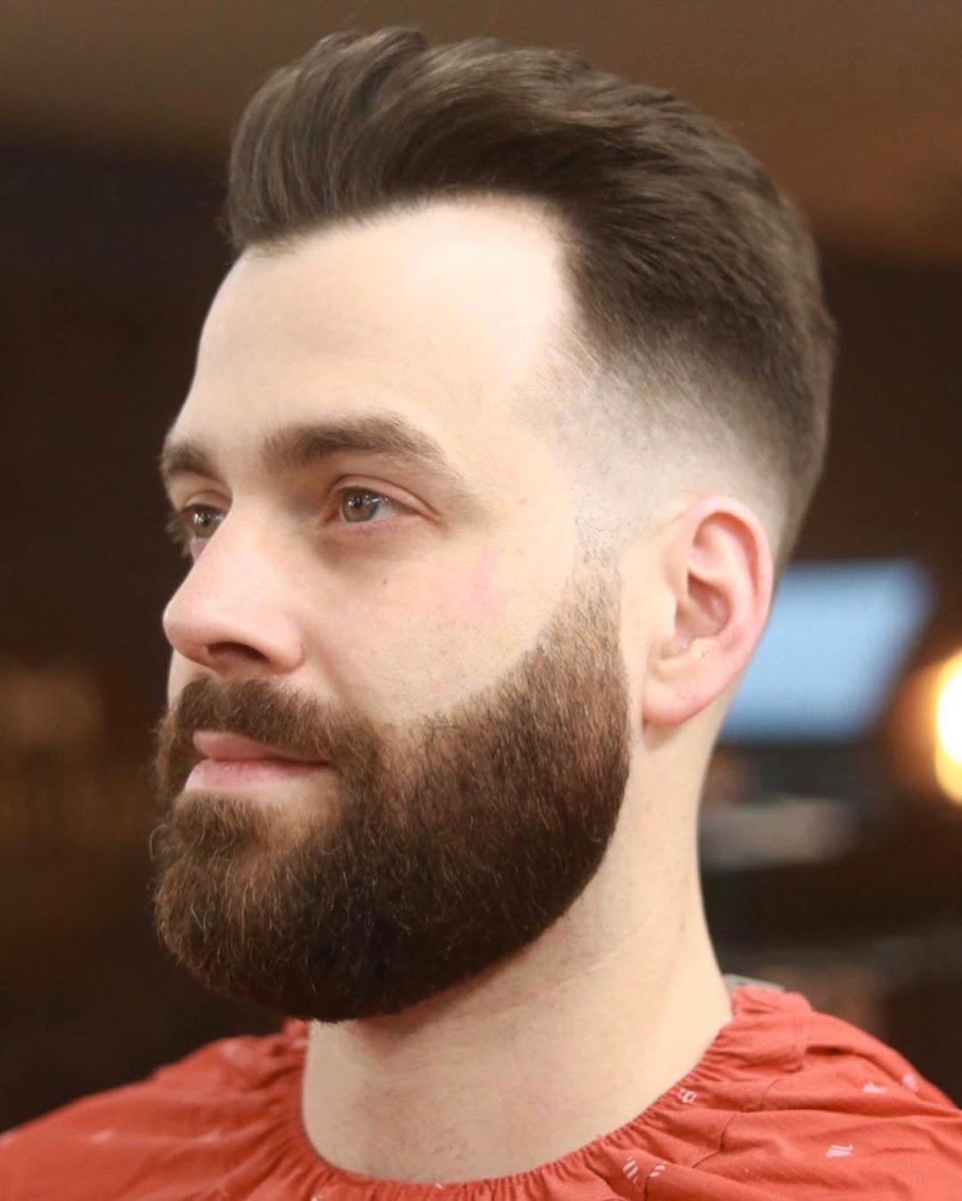 This cut is pure main-character energy. A voluminous, meticulously sculpted top rises with effortless lift, balanced by a skin-tight fade that keeps everything sharp and fresh. The crisp lineup frames the face like a well-tailored suit, and the transition from temple to beard? Seamless.
