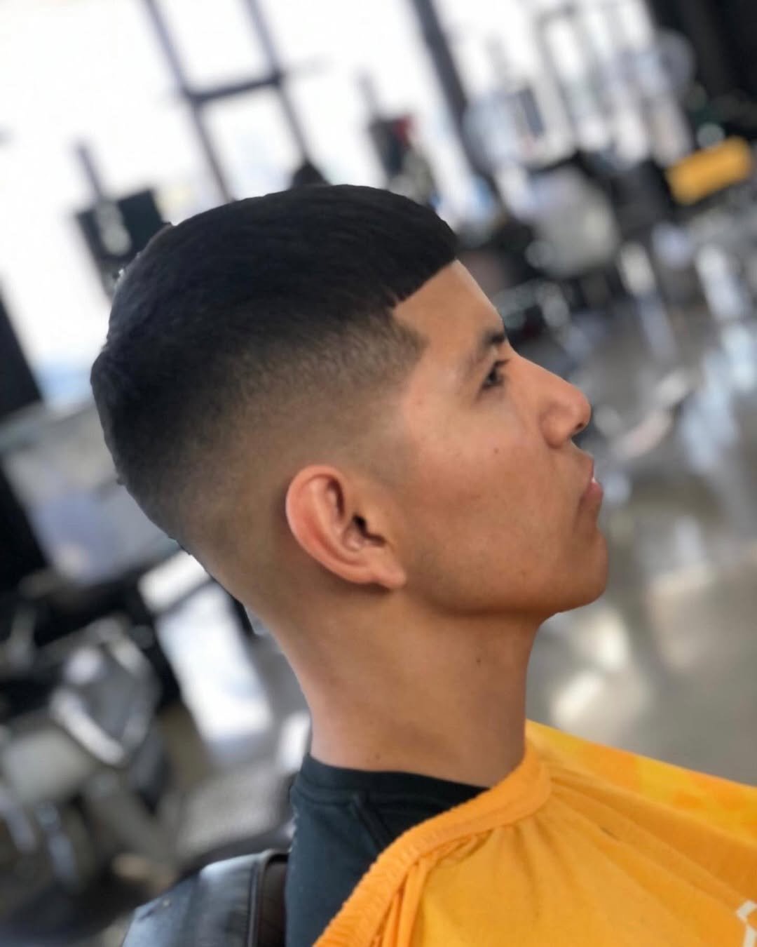 Minimalist. Sharp. Intentional. This crop fade is a study in precision—clean lines, zero fuss, and a fade so seamless it looks airbrushed. The top is kept short and tight, laying flat with a slightly chiseled fringe that enhances the facial structure beautifully.