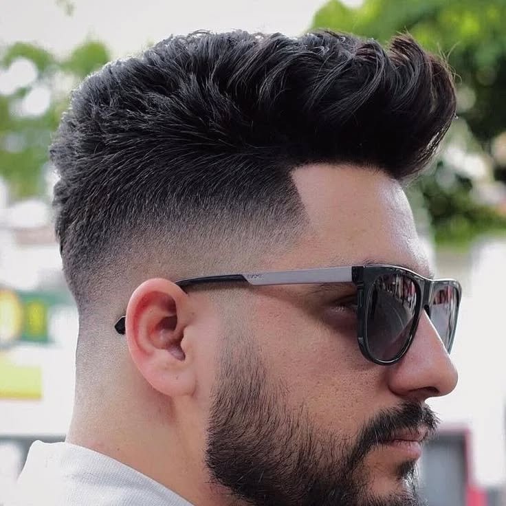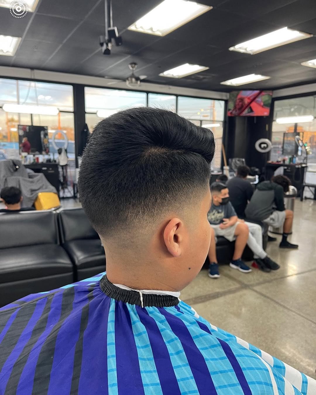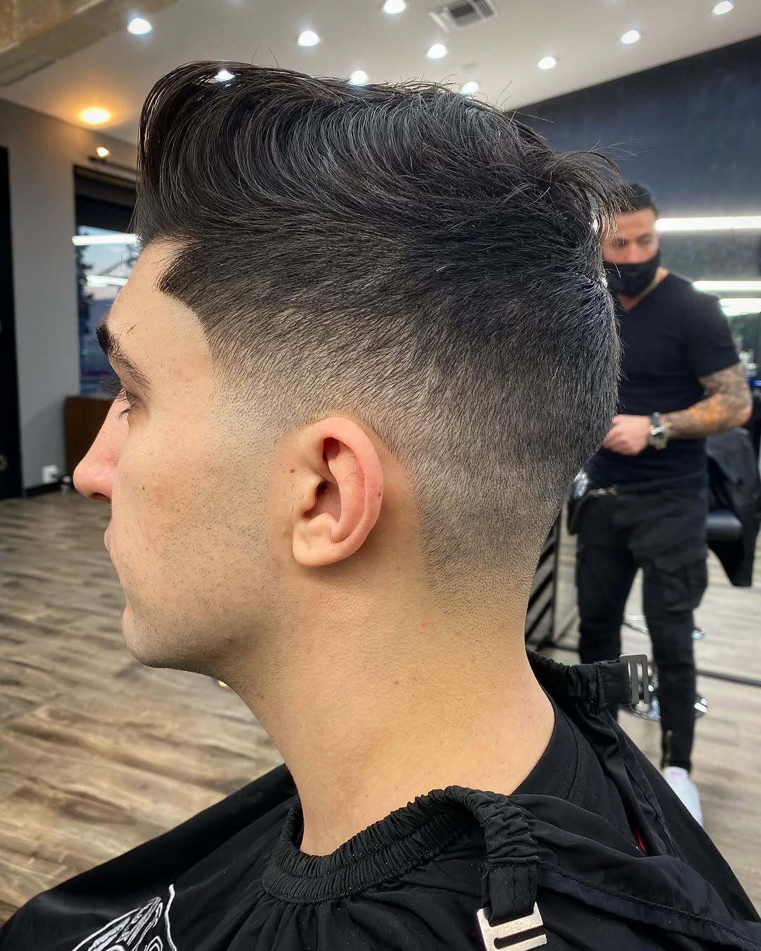 This style channels timeless cool with a fresh, modern polish. The pompadour is swept back with smooth, sculpted volume—think vintage heartthrob meets European street style. What really sets it apart is the flawless fade on the sides, creating a clean contrast that sharpens the whole silhouette.