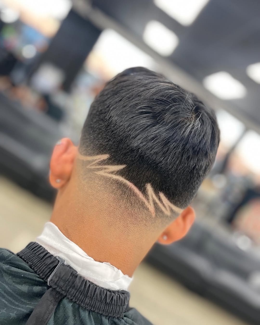 This cut doesn’t whisper — it zaps. The fade is clean and seamless, melting down the neck with a buttery blend. But then, just at the nape, the lightning bolts strike. Sharp, angular etching slices through the smooth gradient like a jolt of energy, giving this style pure electricity.