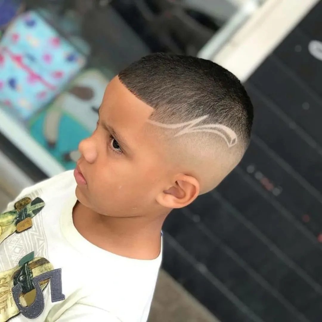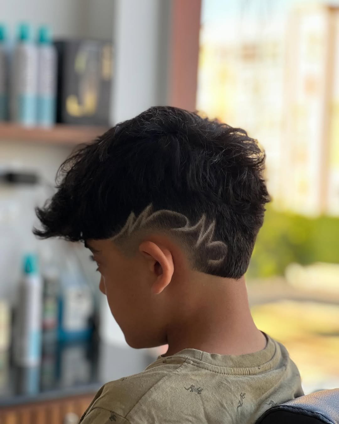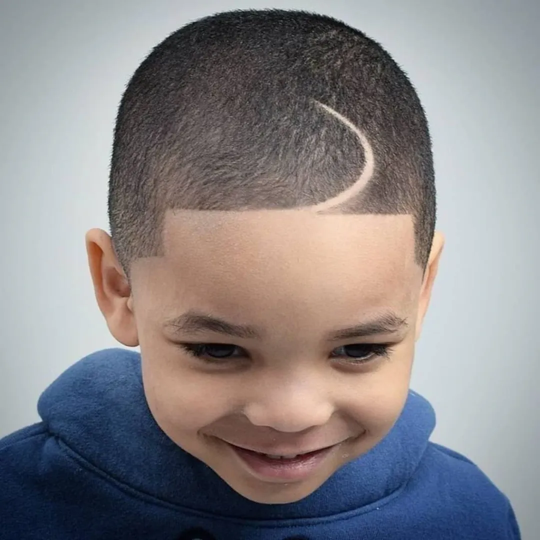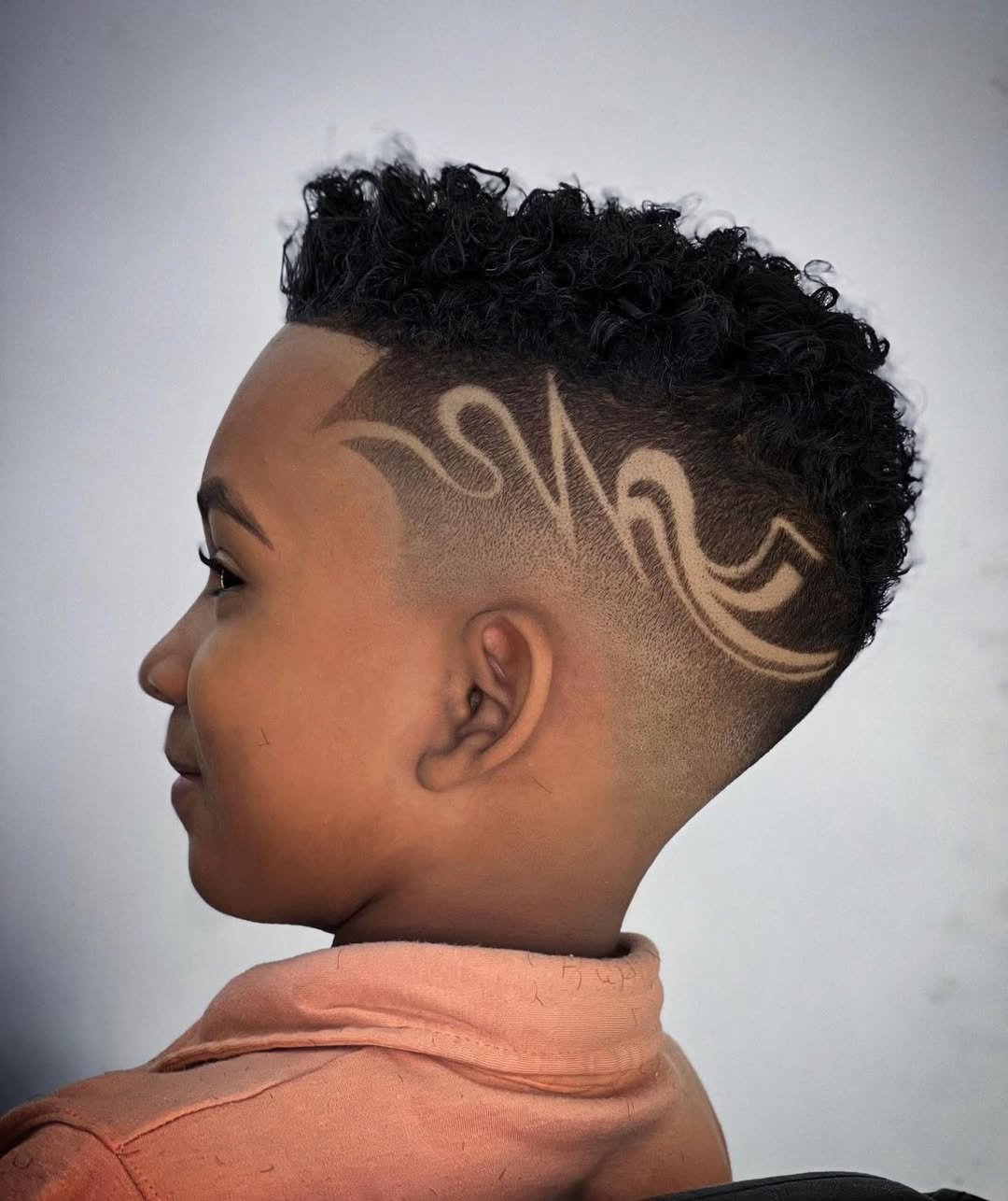 This mini masterpiece proves that bold style starts young. With a flawless high fade and a razor-sharp lineup, the cut already means business—but the curved hair design steals the spotlight. It swoops in like a signature flourish, part superhero, part street-style stamp, and totally unforgettable.