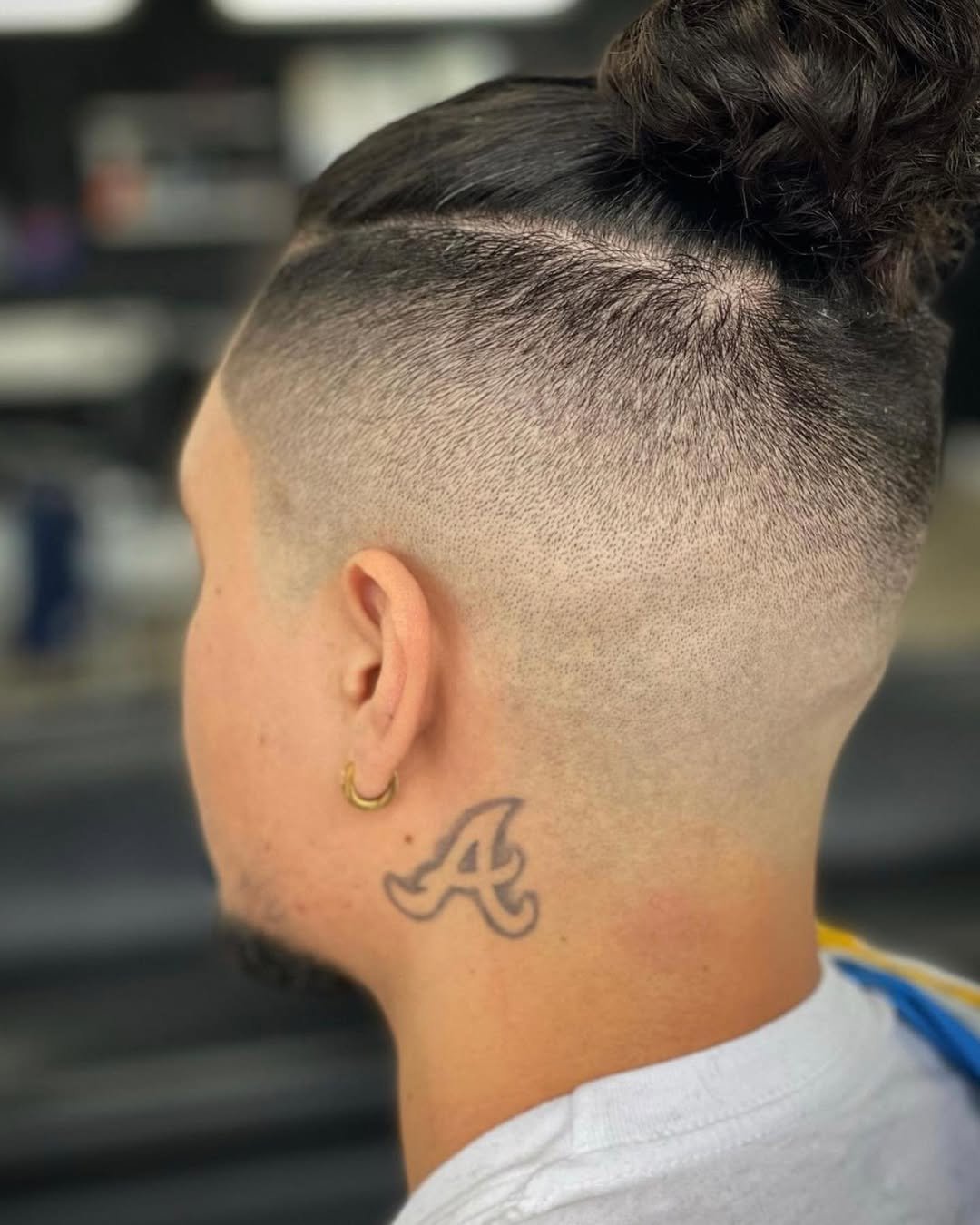 This look is all about clean contrast and confident styling. The ultra-smooth skin fade is so precise, it practically glows—gradually melting into a sharply defined line that separates the buzz from the bun. It’s minimal, but far from forgettable.