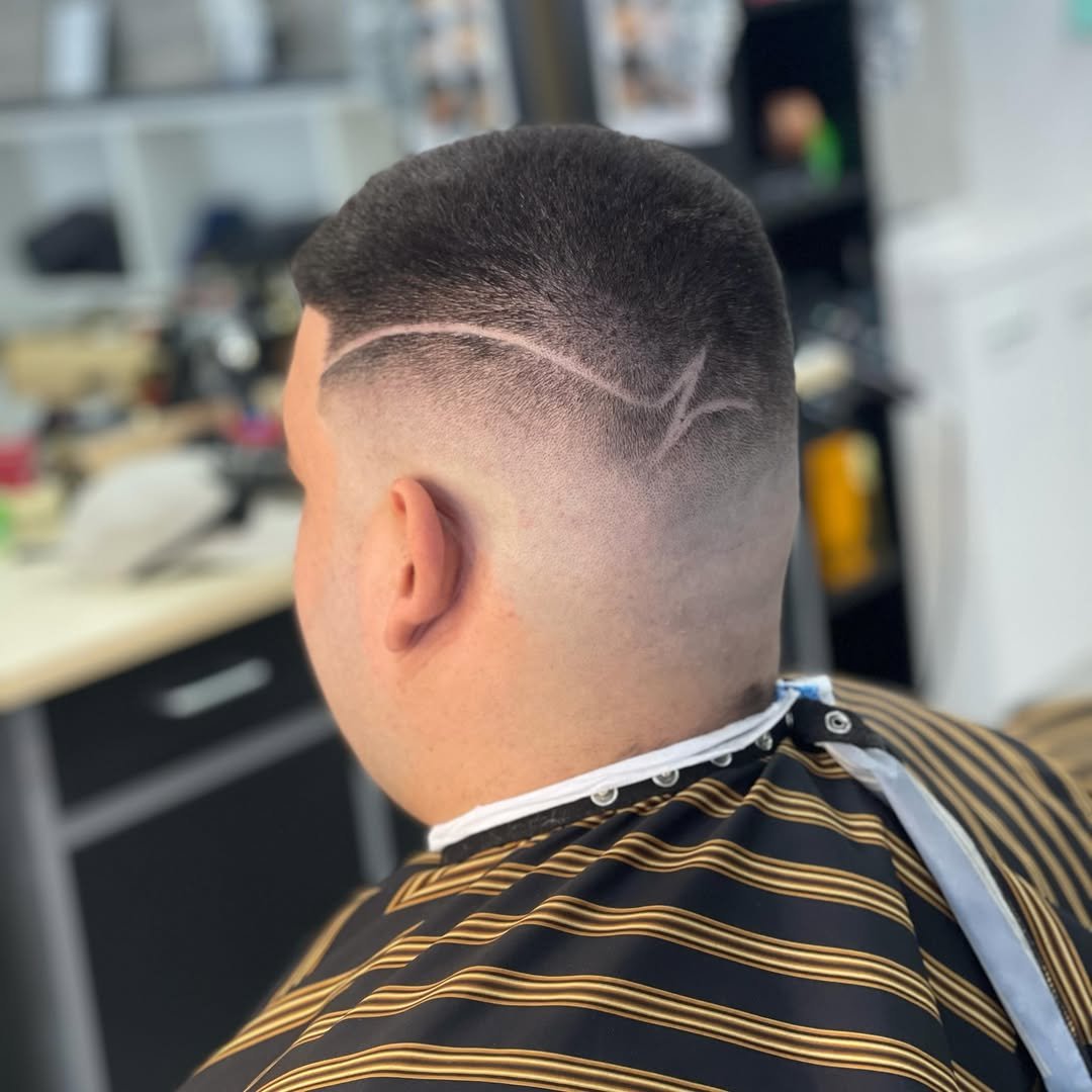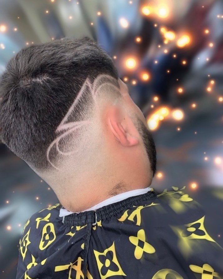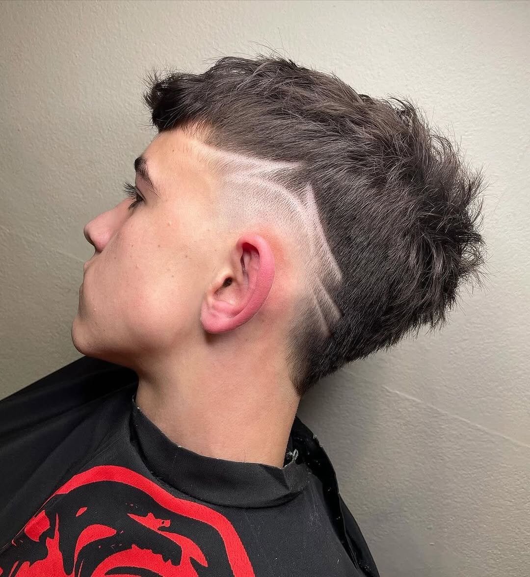 This cut isn’t just a fade—it’s a canvas. With its razor-sharp design work, this style feels like wearable street art, blending edgy creativity with barbershop mastery. The sides are sculpted into a high fade, clean and tight, allowing the intricate swirl patterns to take center stage like bold strokes of a spray can.