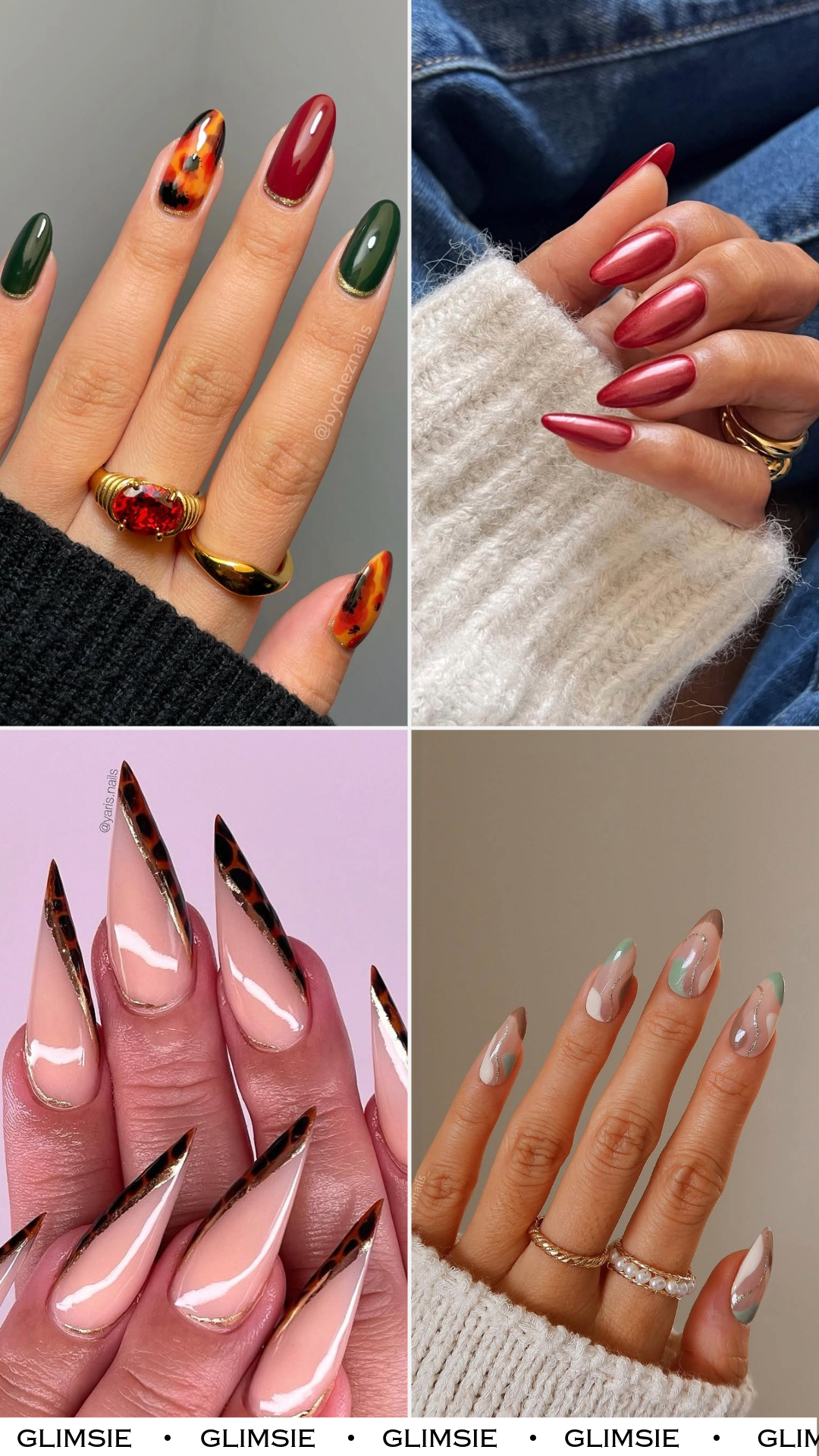 These nails are fall sophistication bottled into 10 tips. Think: rich emerald, dark cherry red, and that tortoiseshell marbling that gives “vintage handbag but make it edgy.” Paired with gold cuticle cuffs? It’s giving luxe dinner party in a dimly lit bar.